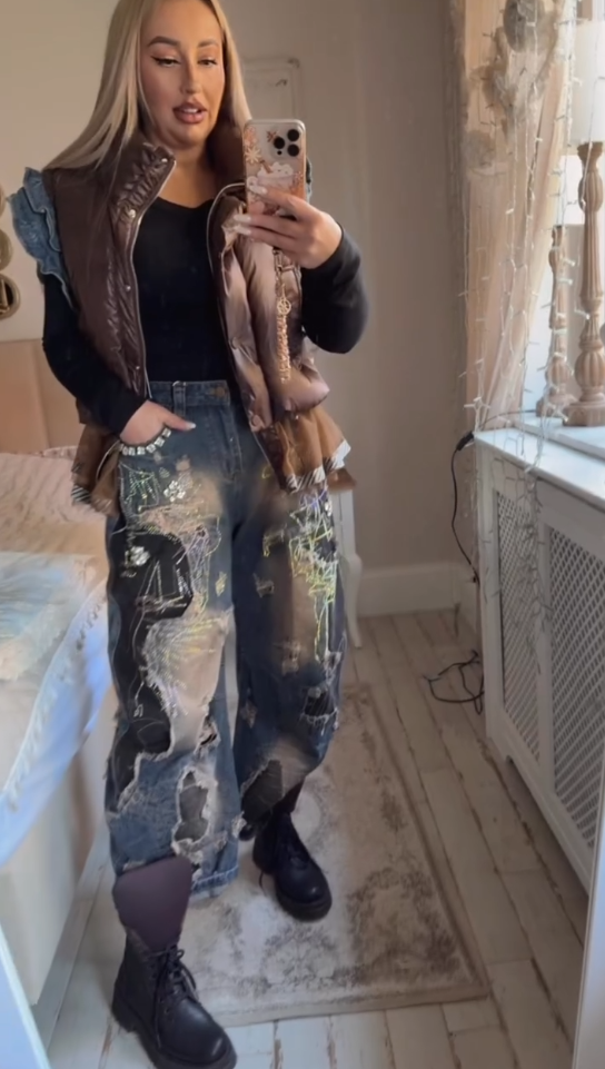 ✨Kamizelka pikowana damska z falbanami, brązowa kamizelka z wysokim kołnierzem w stylu retro ✨Spodnie jeansowe damskie z rozdarciami i holograficznymi zdobieniami, modne spodnie szerokie w stylu vintage ✨
