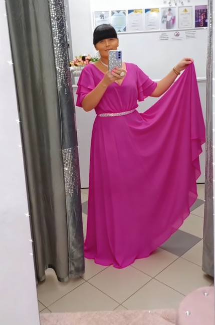 Ta sukienka maxi to idealny wybór na najważniejsze wydarzenia! Głęboki dekolt w kształcie litery V oraz falbankowe rękawy dodają romantycznego charakteru, a błyszczący pasek z cekinami podkreśla talię. Puszysta spódnica z lekkiego materiału gwarantuje wygodę przez całą noc. Idealna na wesela, bale i imprezy wieczorne! 💖