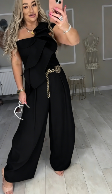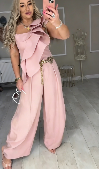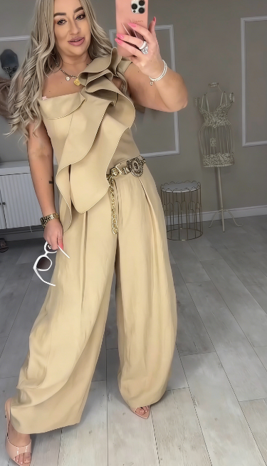 ✨ Podkreślenie sylwetki: Wysoka talia i szerokie nogawki optycznie wydłużają nogi, a falbanki na bluzce odwracają uwagę i podkreślają klatkę piersiową, pasując do różnych typów sylwetki.