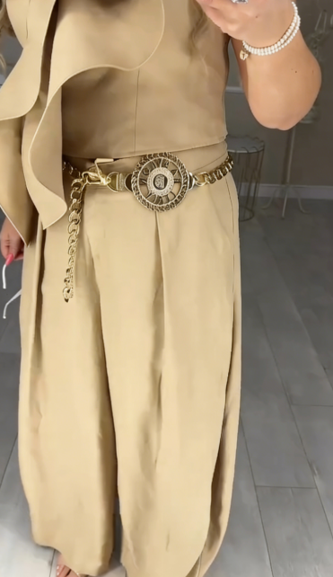 ✨ Luksusowy detal: Ozdobny pasek z metalowymi elementami dodaje elegancji i wyrazistości, sprawiając, że zestaw wyróżnia się na tle innych stylizacji.