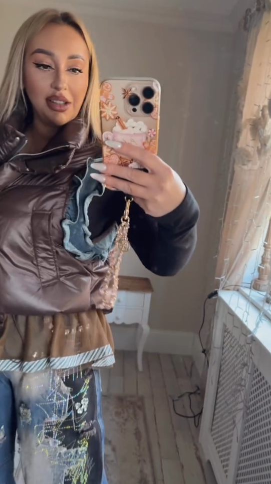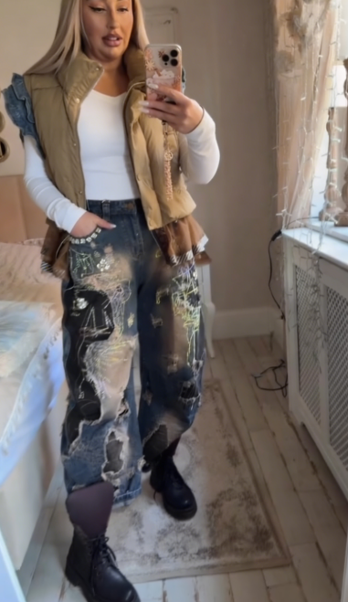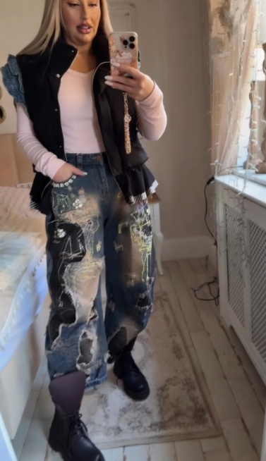 Spodnie jeansowe typu mom fit: Szerokie, wygodne nogawki z efektem zniszczonych dziur i przetarć, ozdobione holograficznymi, błyszczącymi wzorami oraz aplikacjami z kryształkami na kieszeni, co nadaje im unikalny, streetwearowy charakter.