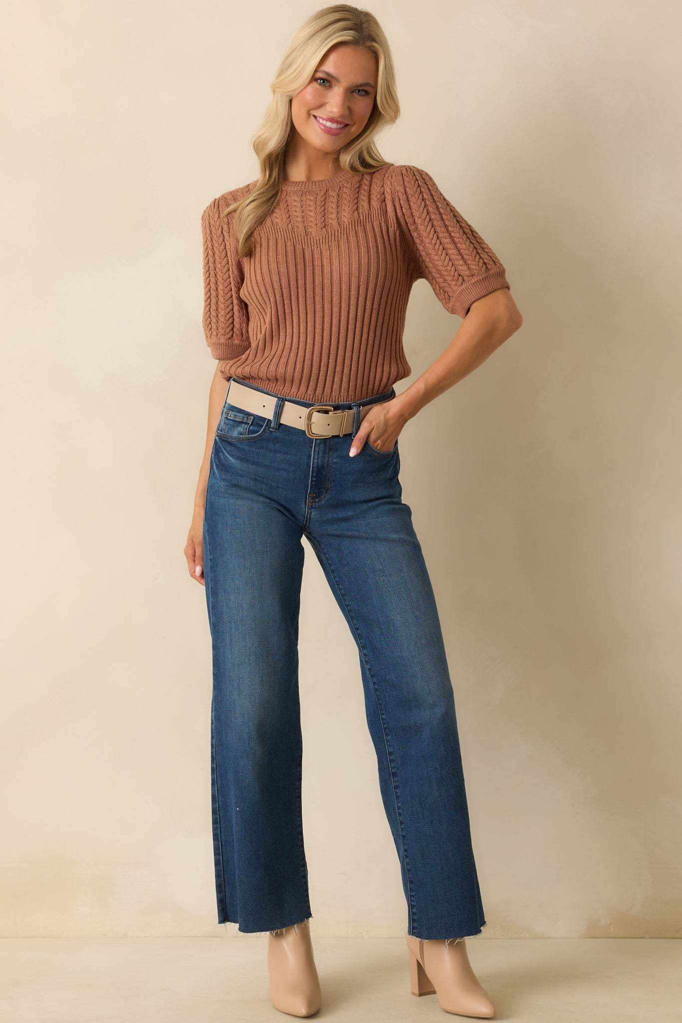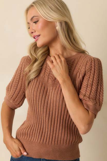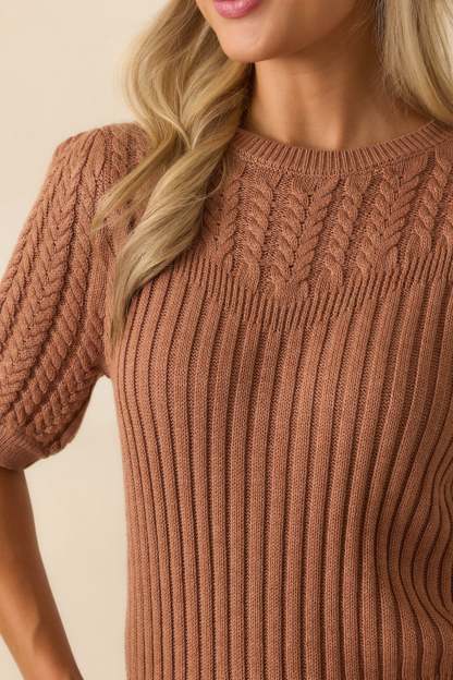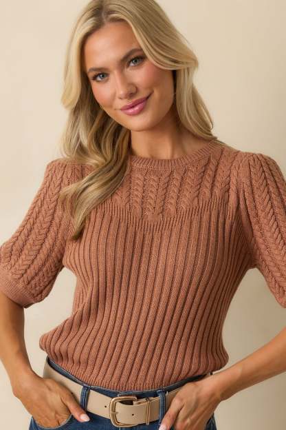 The Don’t Doubt It Clay Brown Cable Knit Short Sleeve Ribbed Sweater leaves no second guesses, a cozy classic that feels instantly right every time. This clay brown sweater features a ribbed knit body with cable knit detailing at the yoke and sleeves, short puff sleeves, crew neckline, fitted ribbed cuffs, and a straight hem.