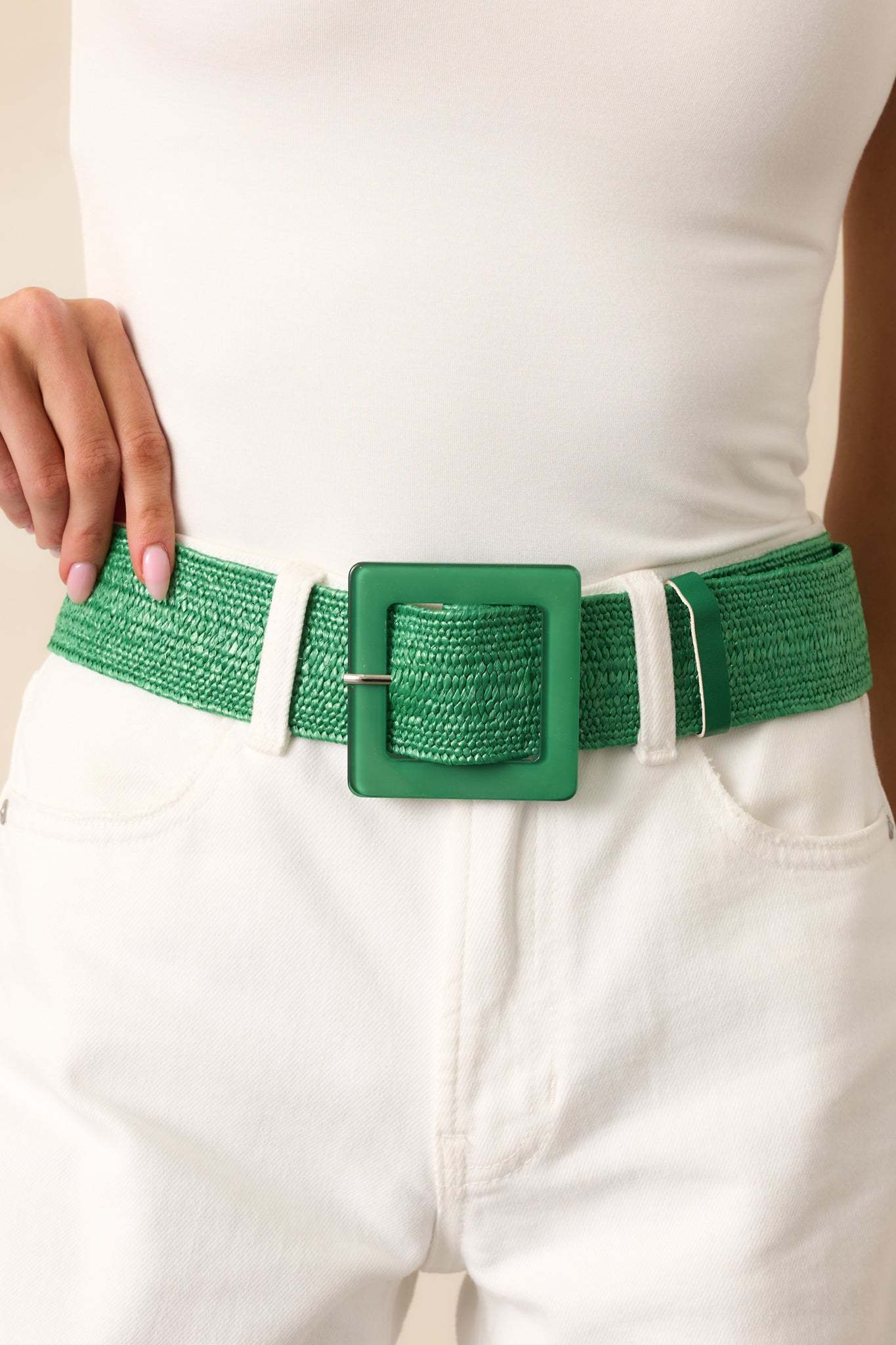 The Everything Falls Into Place Kelly Green Woven Straw Belt is for the days when it all just works—your plans, your mood, your outfit. Effortless and grounded, it’s the finishing touch that brings it all together without even trying. This kelly green belt features a woven elastic material, and an adjustable green acrylic square pin buckle.