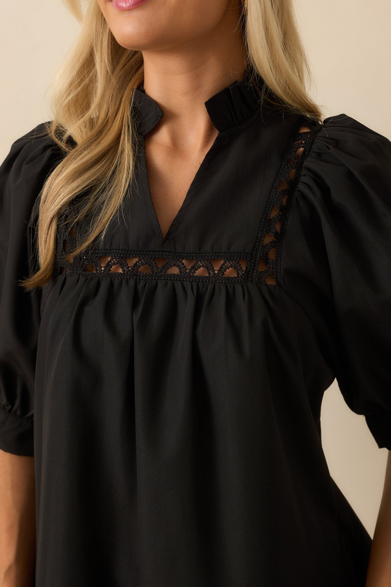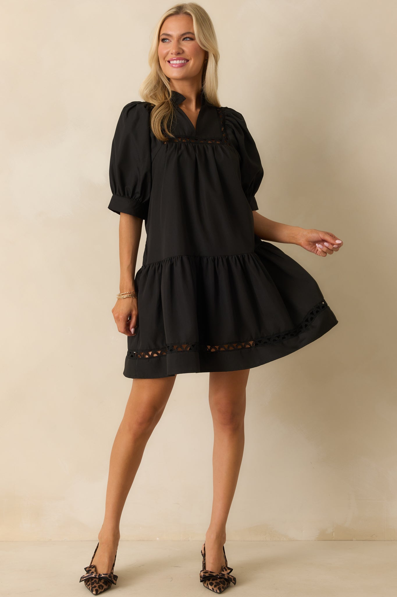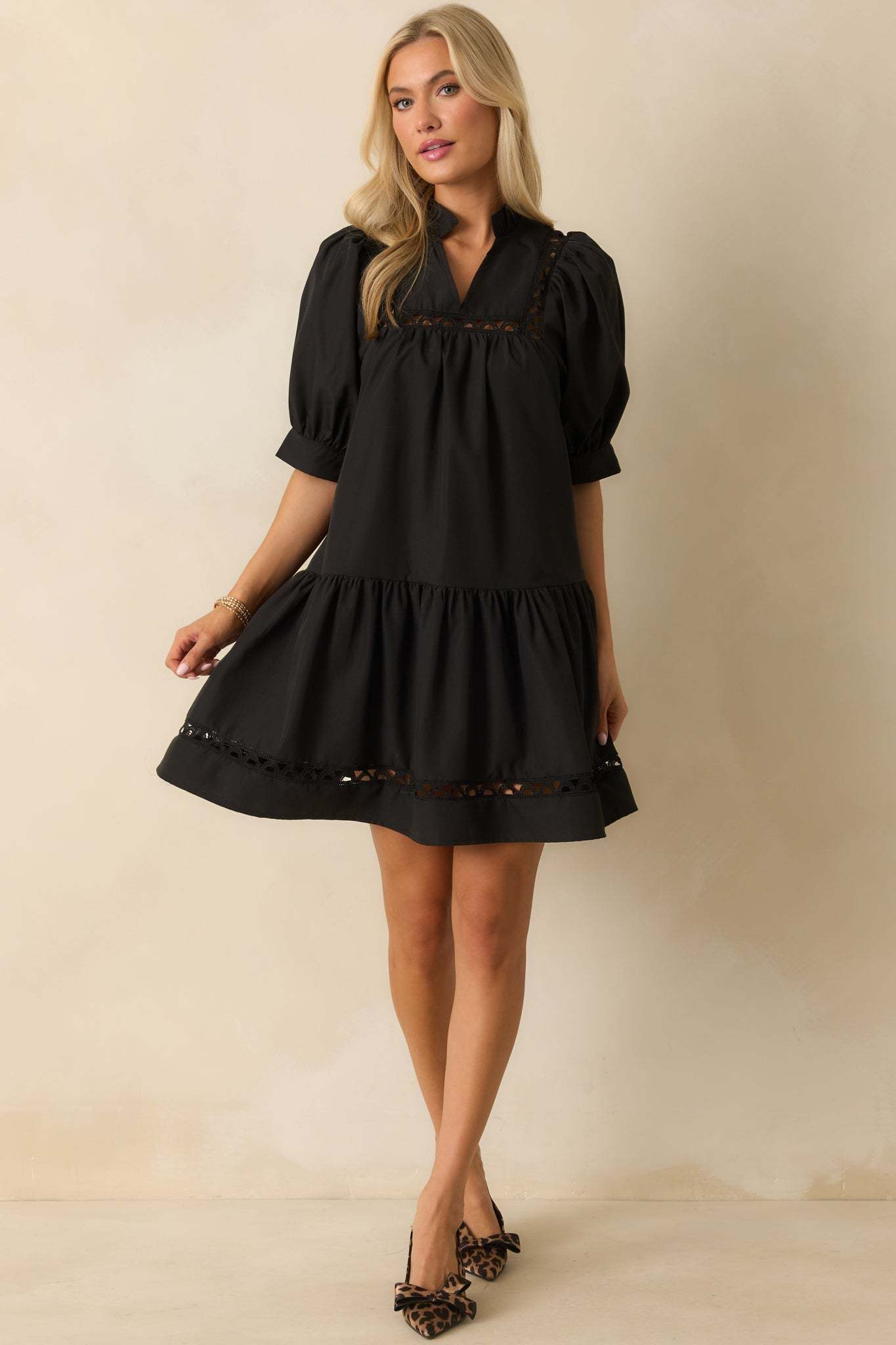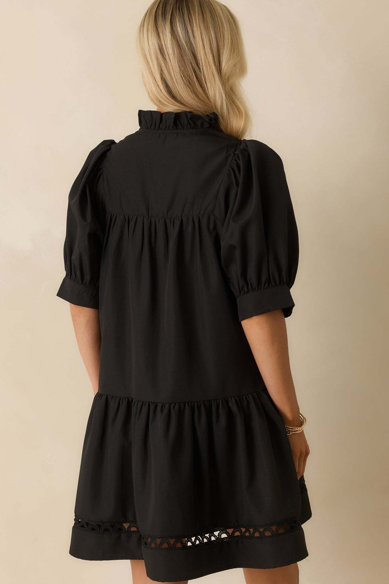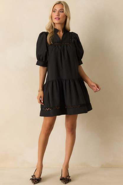 The Feels Just Right Black Puff Sleeve Embroidered Eyelet Mini Dress is all about those moments when everything clicks. It’s feminine, flattering, and has just the right amount of charm to make you feel your best. This black mini dress features a ruffle-trimmed split v-neckline, short puff sleeves, and ladder lace inserts throughout, a tiered hem, and functional pockets.