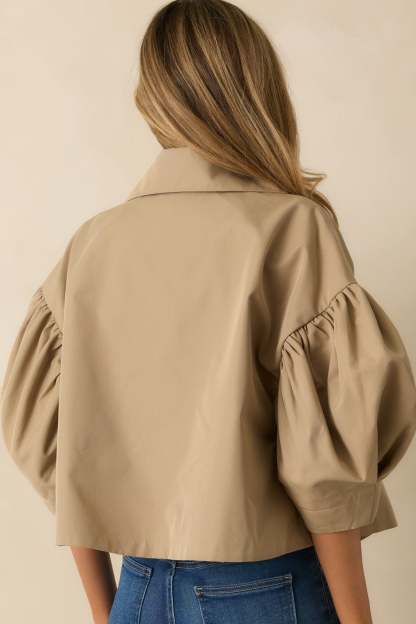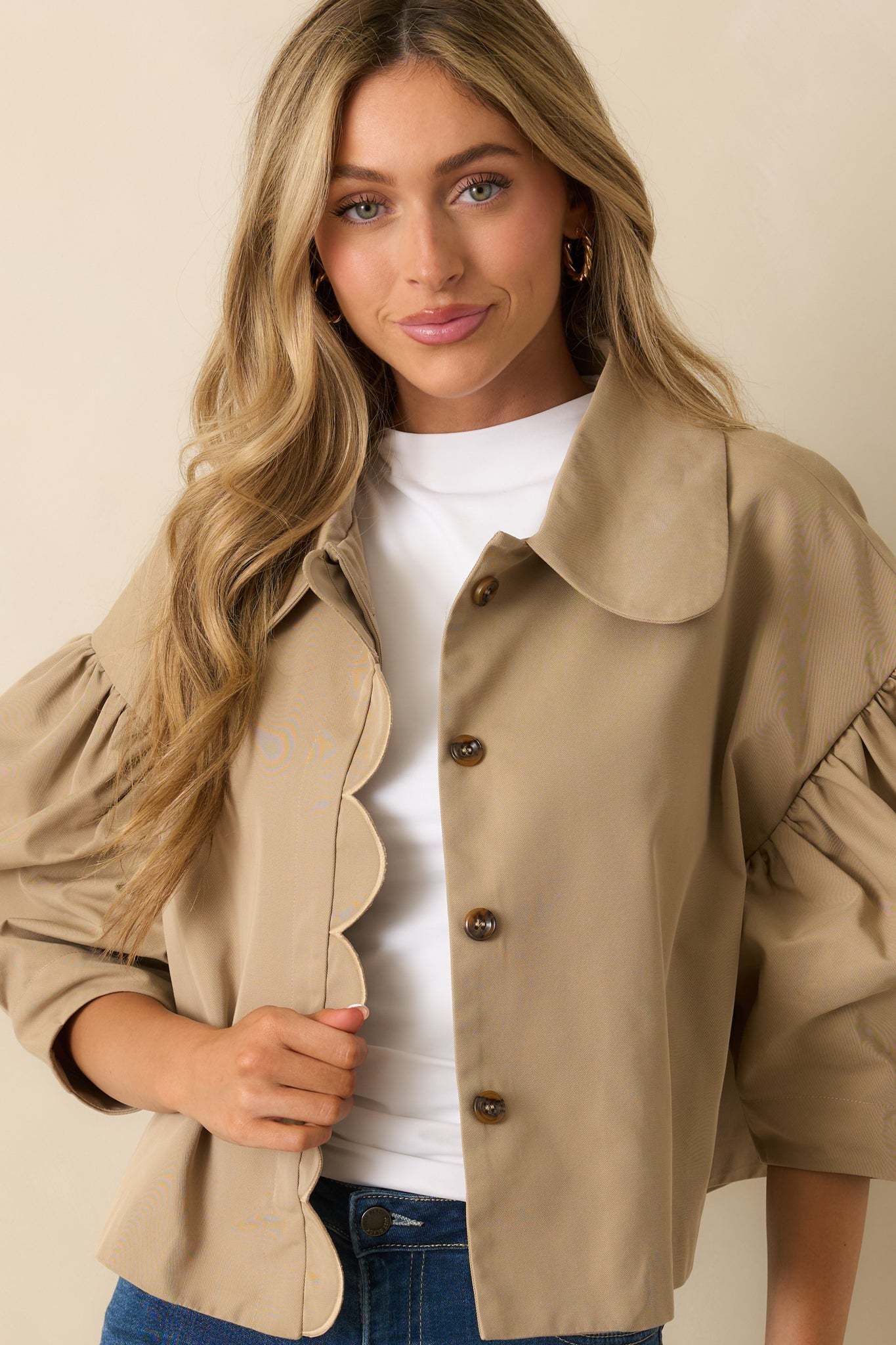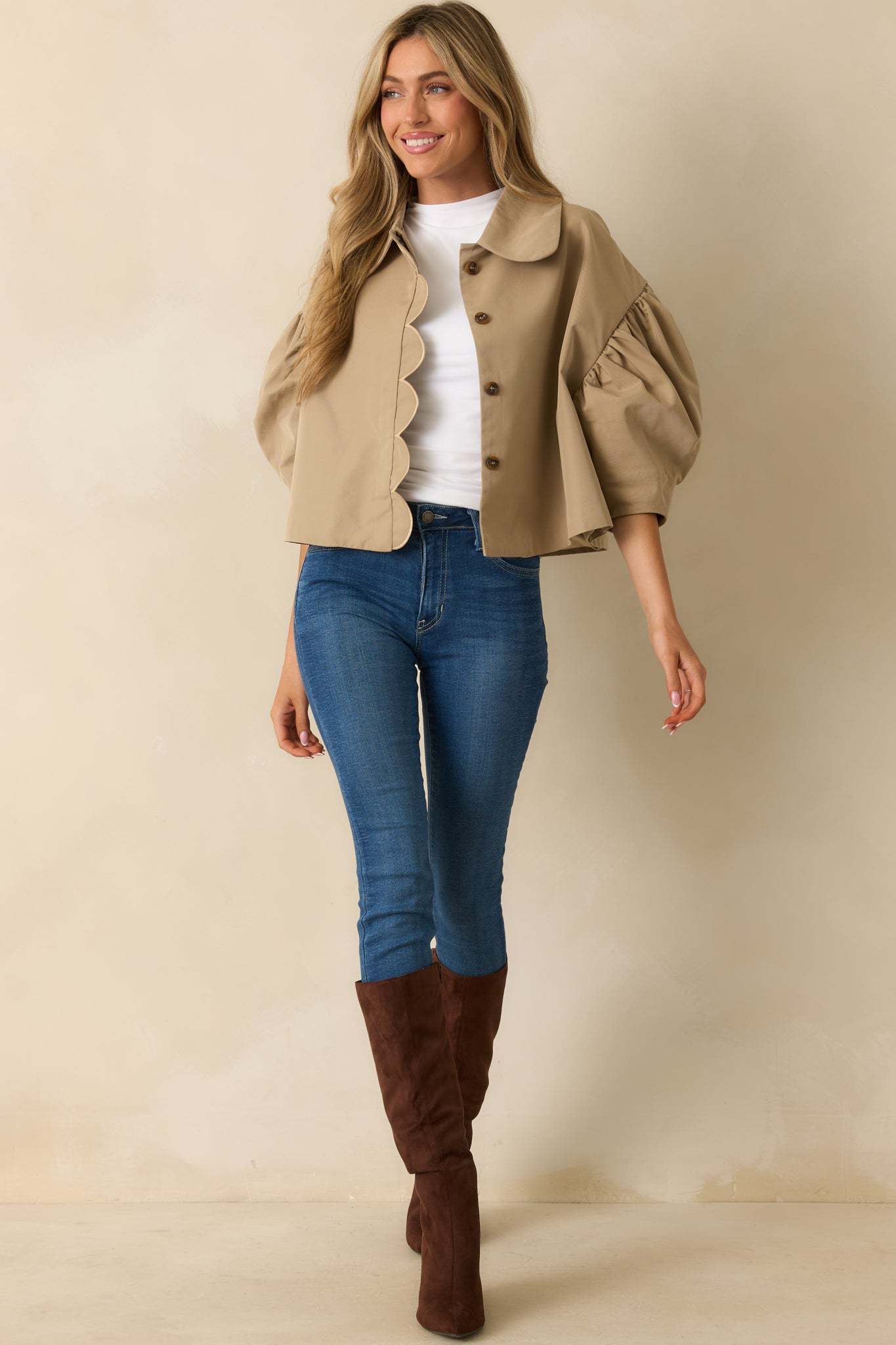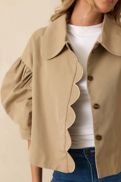 The For the Frill of It Taupe Scalloped Puff Sleeve Jacket brings a feminine twist to your classic layers. With its softly structured shape, scalloped front edge, and voluminous sleeves, it’s the kind of piece that makes everyday dressing feel a little more special. This taupe woven jacket features puff sleeves with gathered shoulders, a scalloped front placket, button-front closure, a rounded collar, and a cropped length.