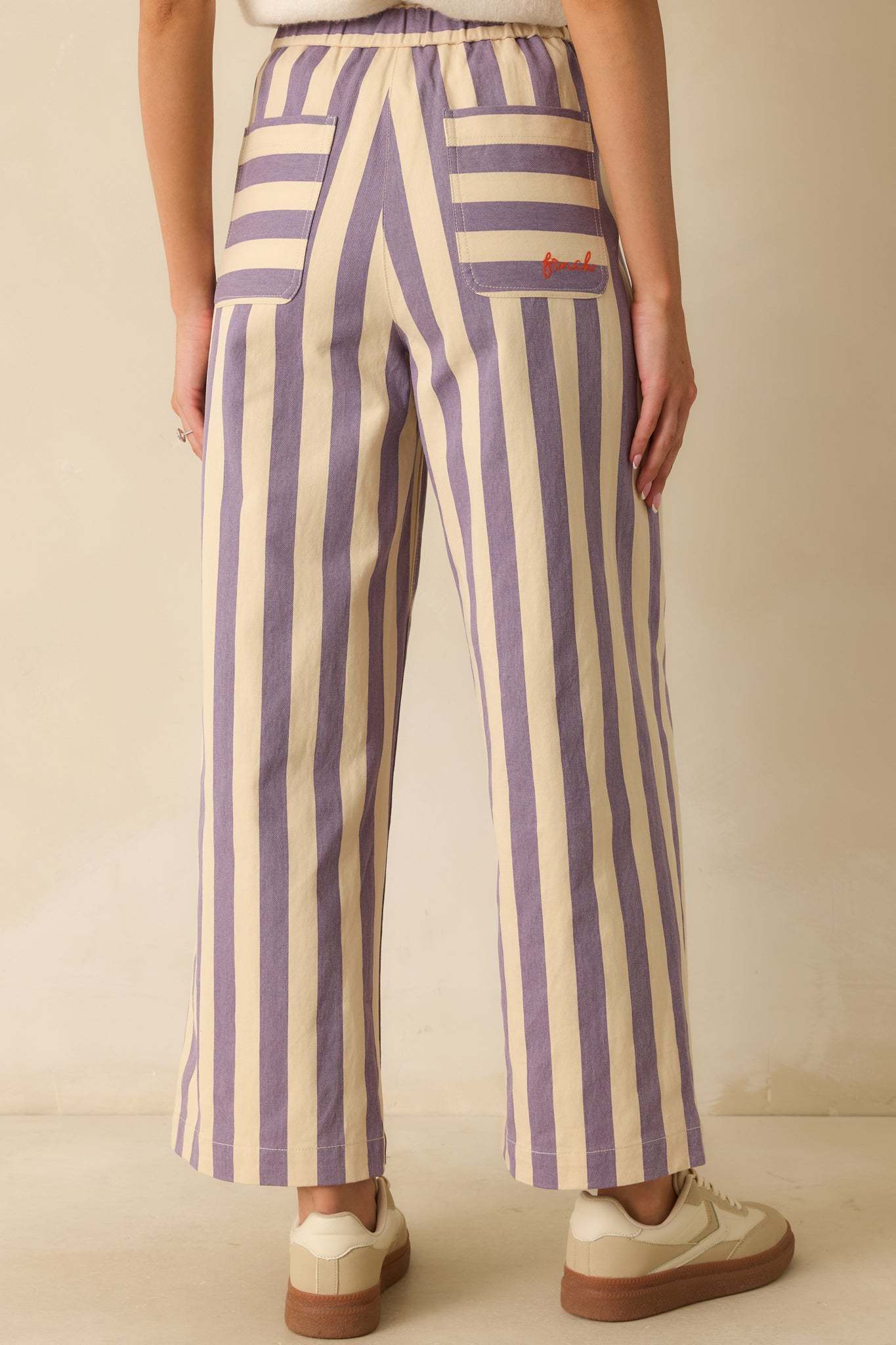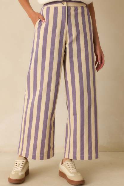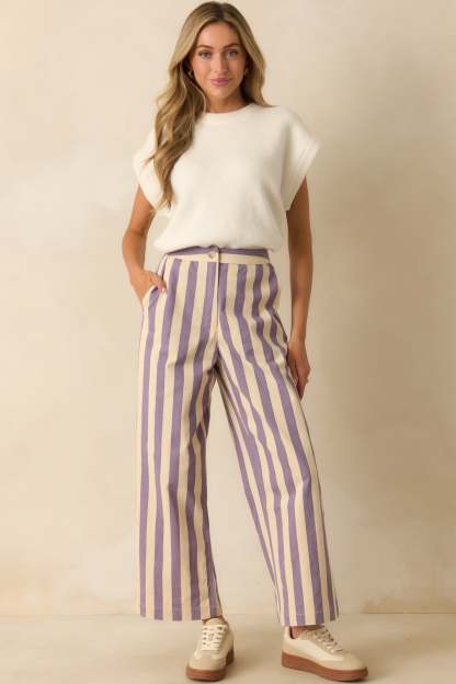 The FRNCH Lilac Striped Wide Leg Austen Pants bring a playful yet refined touch to everyday dressing, featuring bold vertical stripes that elongate the silhouette. Their easy, tailored shape and soft woven fabric make them the perfect mix of statement style and laid-back comfort. These lilac striped pants feature a high-rise waist and wide-leg silhouette with cream and lilac vertical stripes, side pockets, and a front button-and-zip closure for a tailored yet relaxed finish.