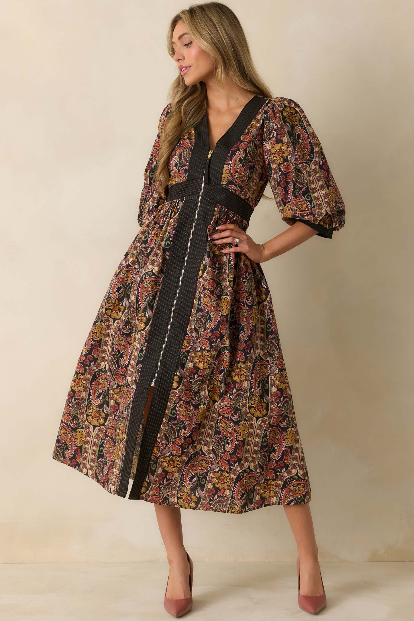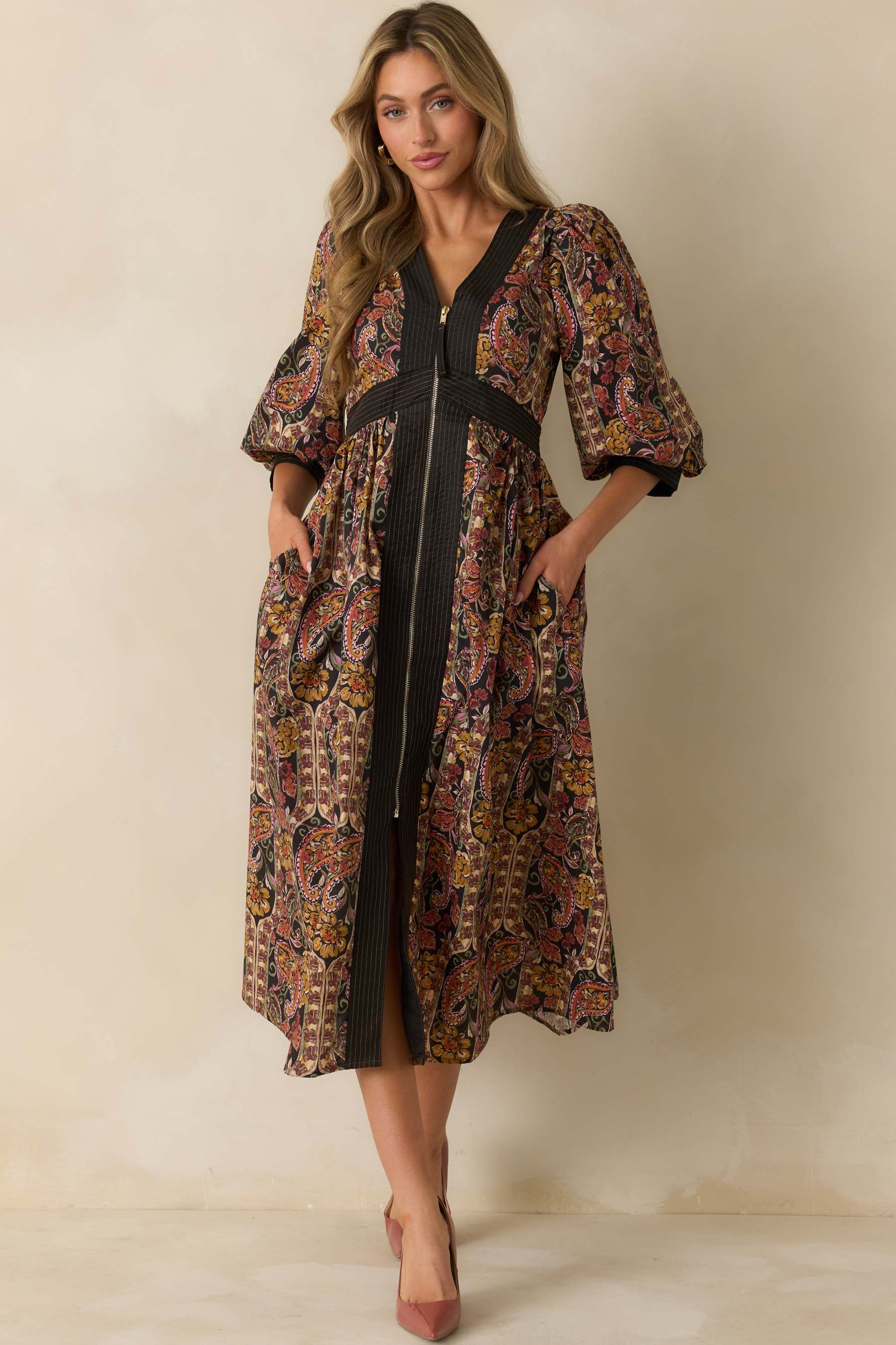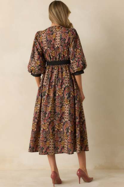 The Garden at Dusk Black Multi Floral Paisley Print Cotton Zip Up Maxi Dress brings artful drama to every moment. Designed with a deep V-neckline, puff sleeves, and a defined waist, it captures the richness of twilight with its intricate floral paisley print and black trim with contrasting golden yellow stitching. The full skirt moves beautifully with you, creating a look that feels equal parts vintage-inspired and undeniably modern. This black paisley floral print maxi dress features a deep V-neckline, half puff sleeves with banded cuffs, a fitted waist with striped detailing, a front zip closure, and a flowy A-line skirt with side pockets.
