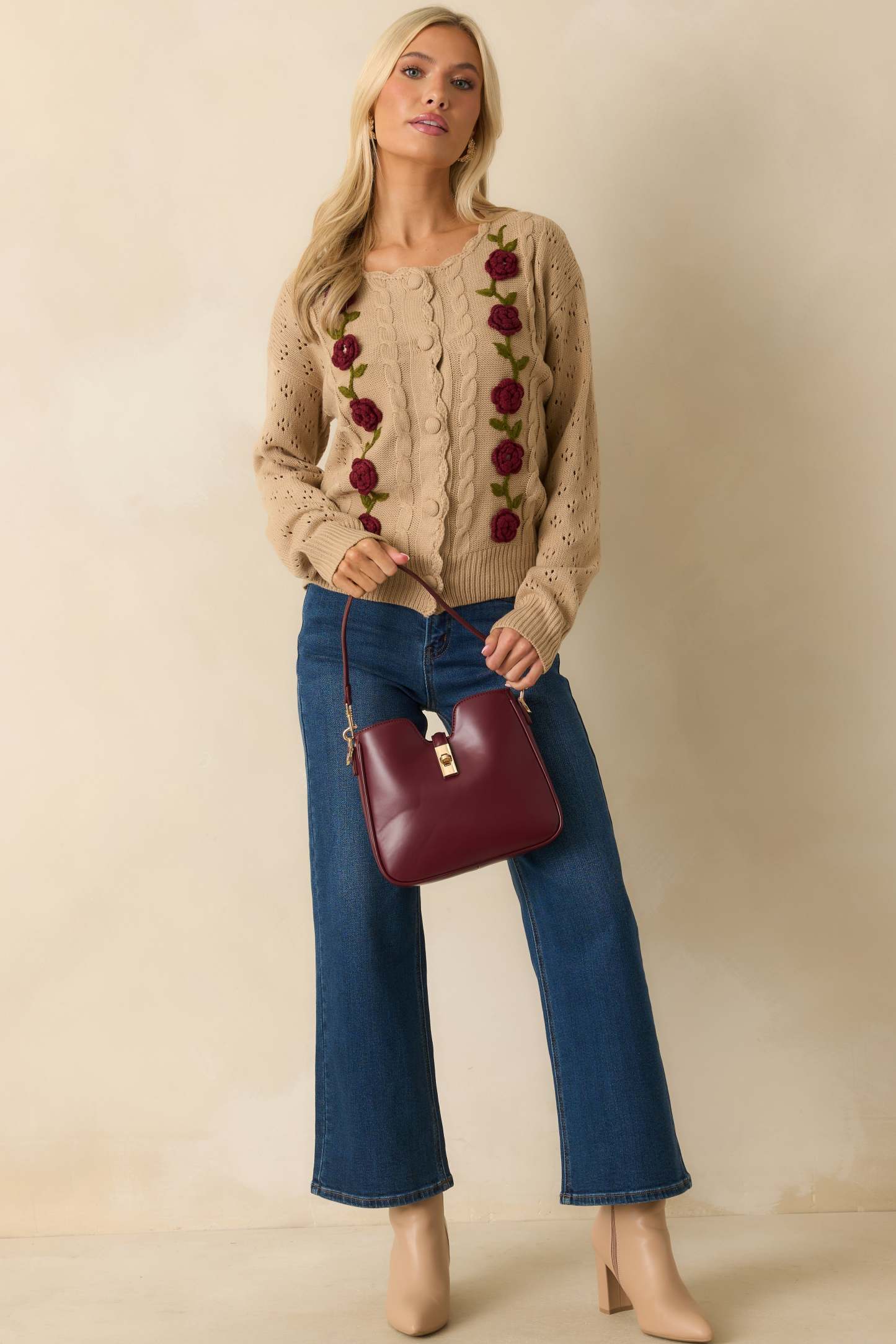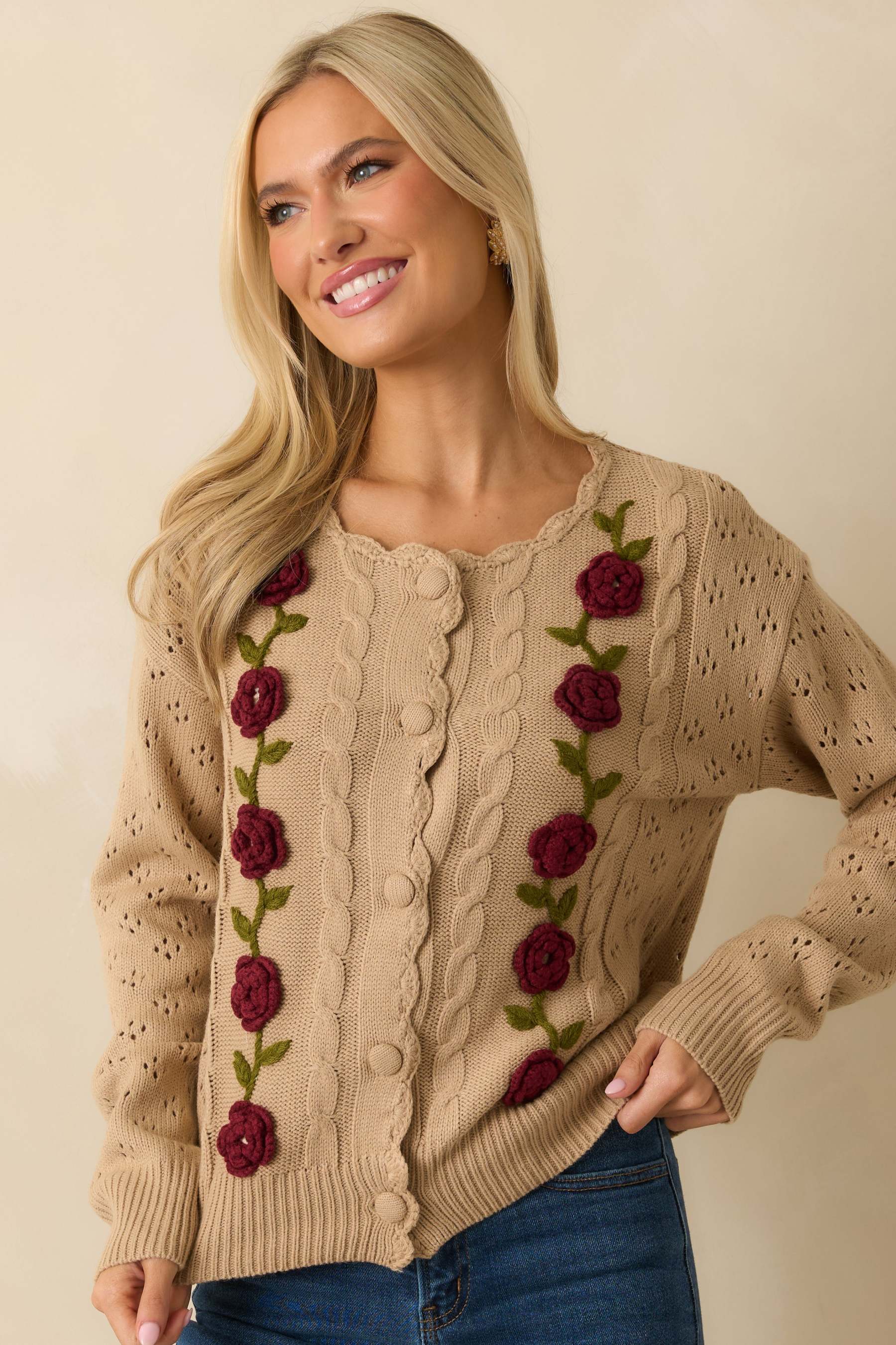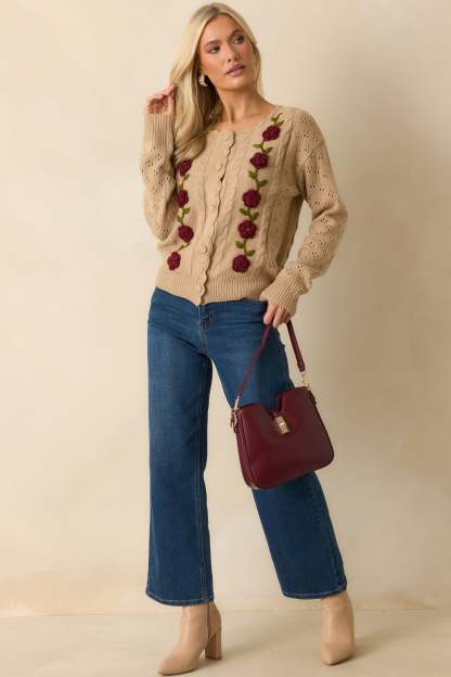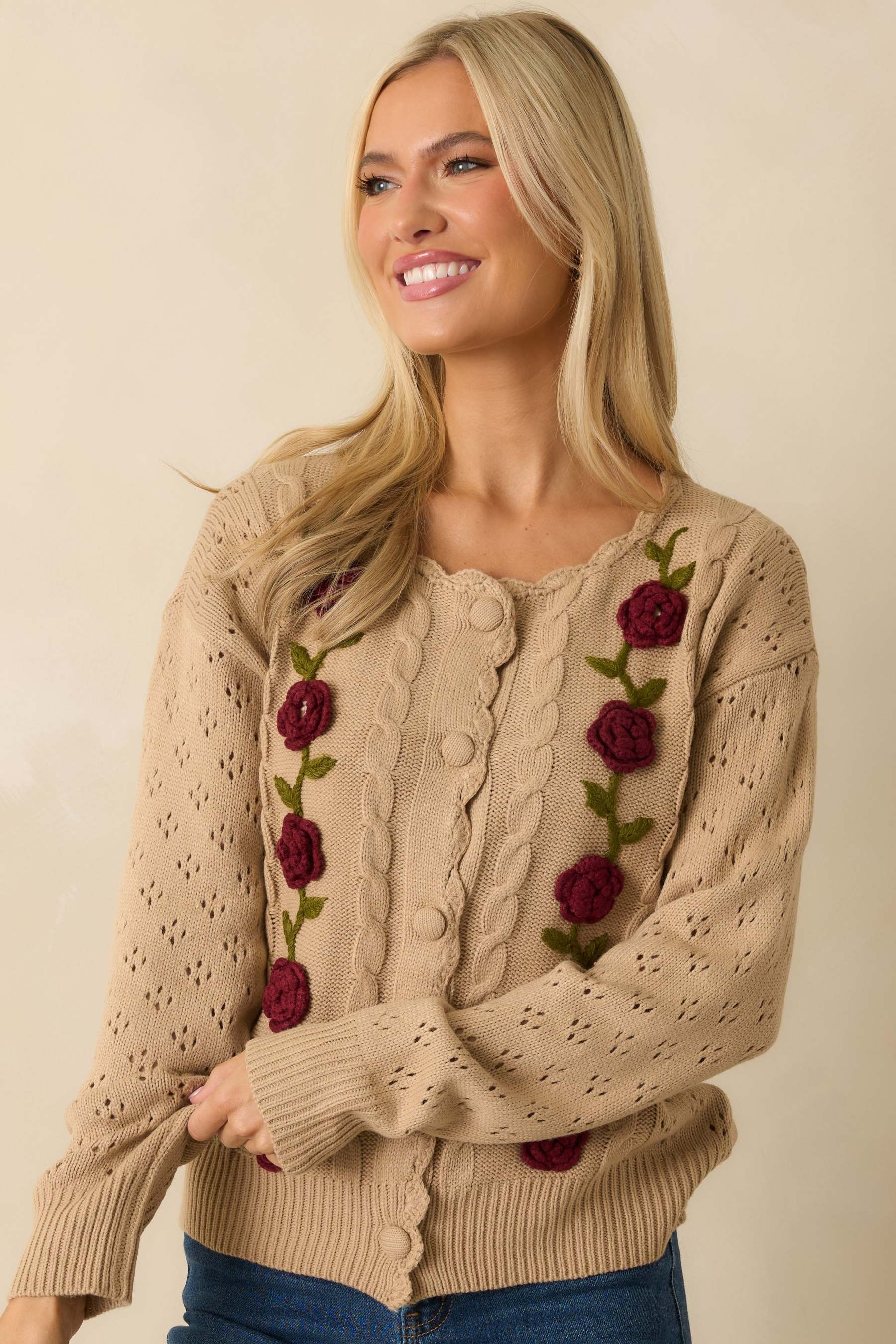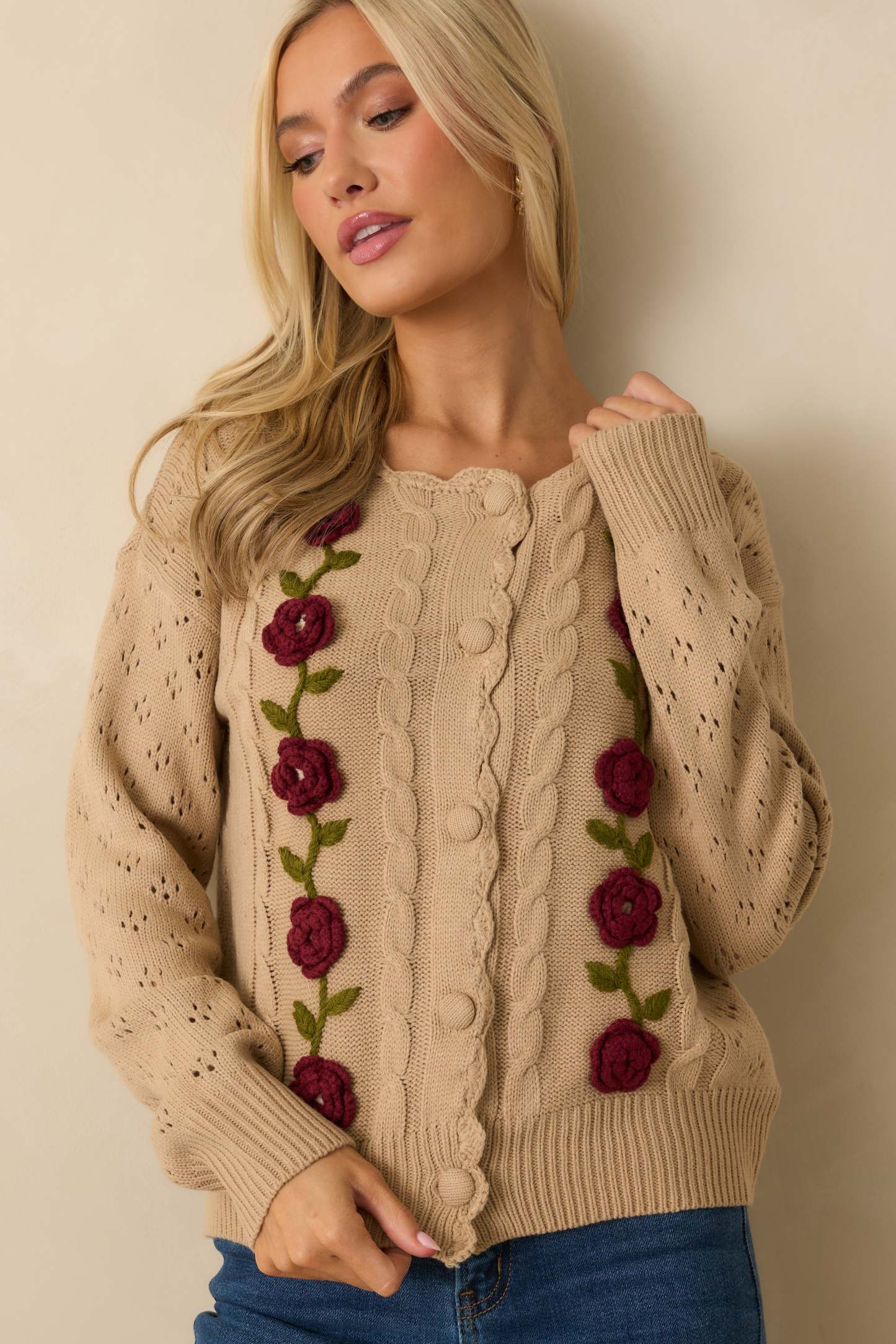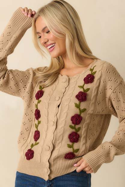 The Garden Variety Taupe Floral Knit Button-Up Cardigan is anything but ordinary. With its intricate cable-knit texture and charming 3D floral appliqués, it feels like a modern heirloom you’ll reach for again and again. Soft, feminine, and full of character, it brings a touch of cottage-inspired romance to even your simplest outfits. This taupe knit button-up cardigan features long sleeves, a cable-knit front with tonal button closures, openwork knit sleeves, and dimensional floral appliqué detailing for a textured finish.