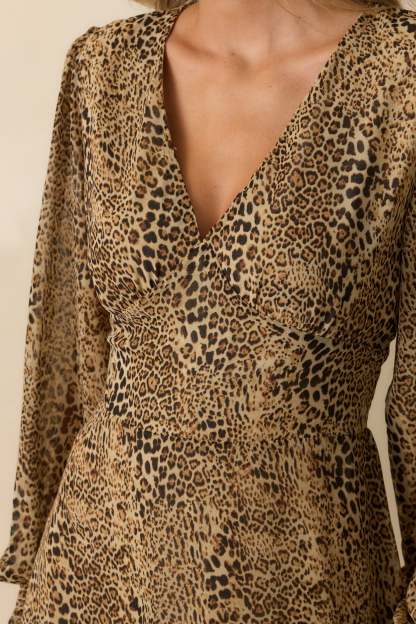 The Hold On To This Tan Leopard Print Chiffon Mini Dress makes an unforgettable impression, a chic, flowy style that’s ready for every standout moment. This chiffon mini dress features a tan leopard print throughout, deep v-neckline, long balloon sleeves with smocked cuffs, a fitted waistband, elastic smocked back insert, a ruffled skirt bottom, and a full length tan lining.