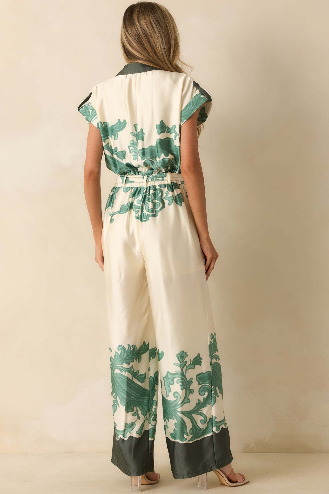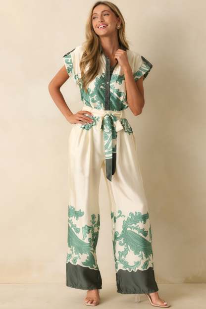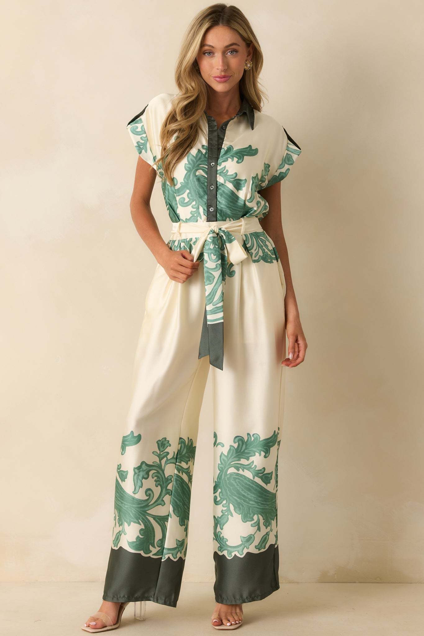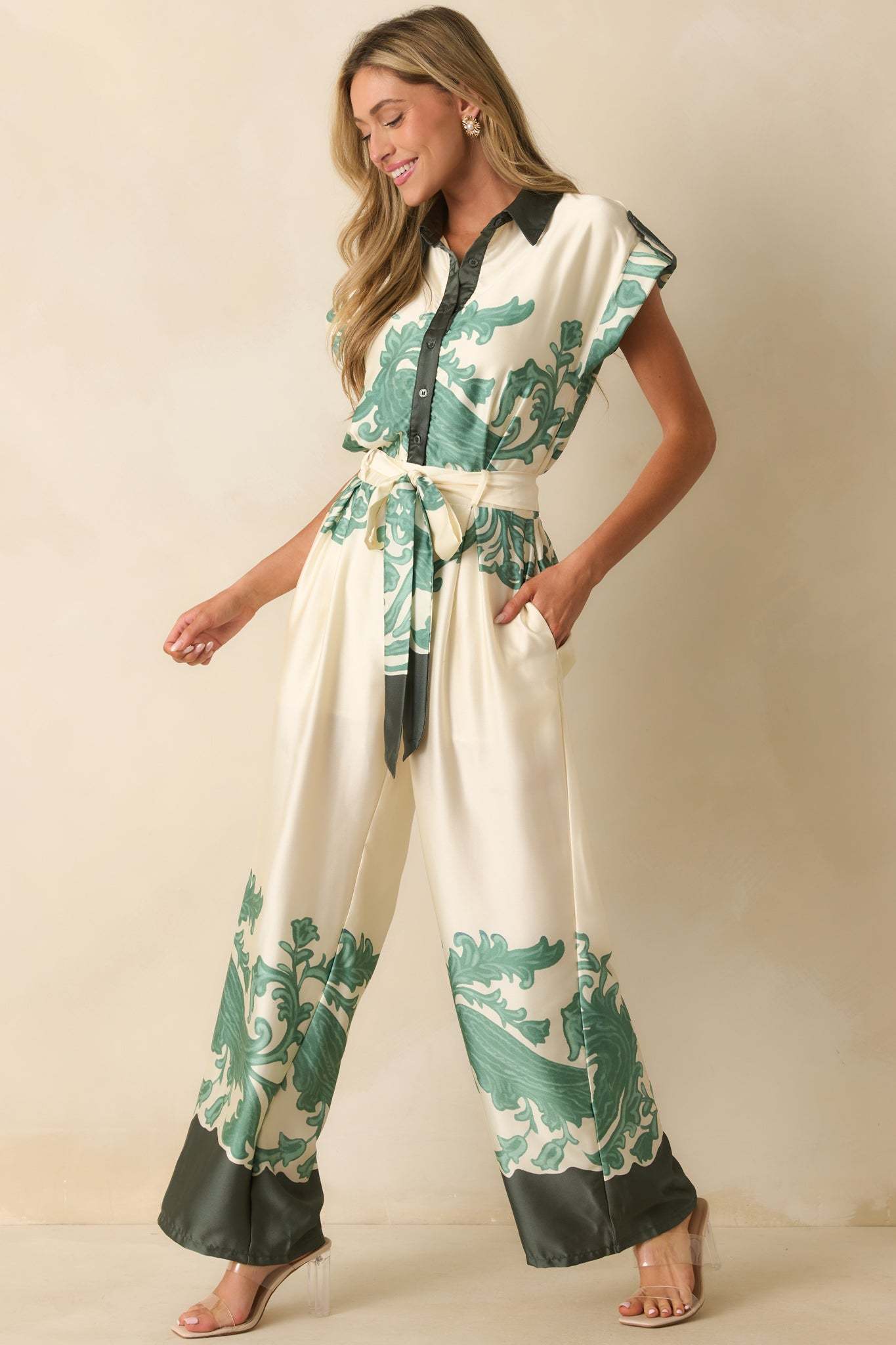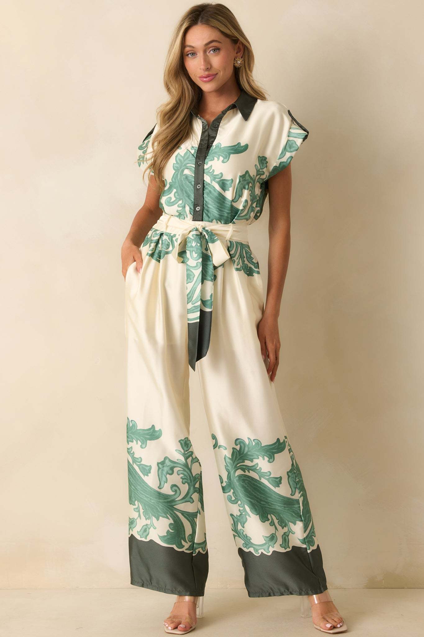 The In So Many Words Green Multi Print Button Up Wide Leg Jumpsuit says it all, a bold and effortless look that speaks volumes without even trying. This jumpsuit features an ivory base with a green ornate baroque-inspired border print, collared neckline, cuffed short sleeves, functional button front bodice, optional self-tie sash belt, elastic back waistband insert, green contrast trim, and a wide-leg silhouette.