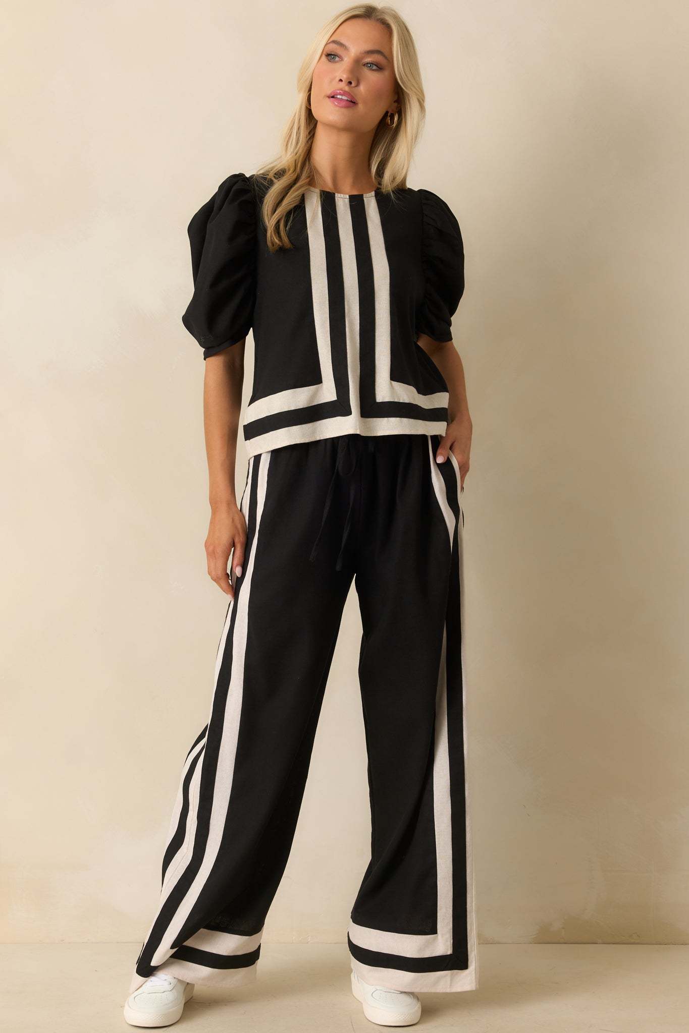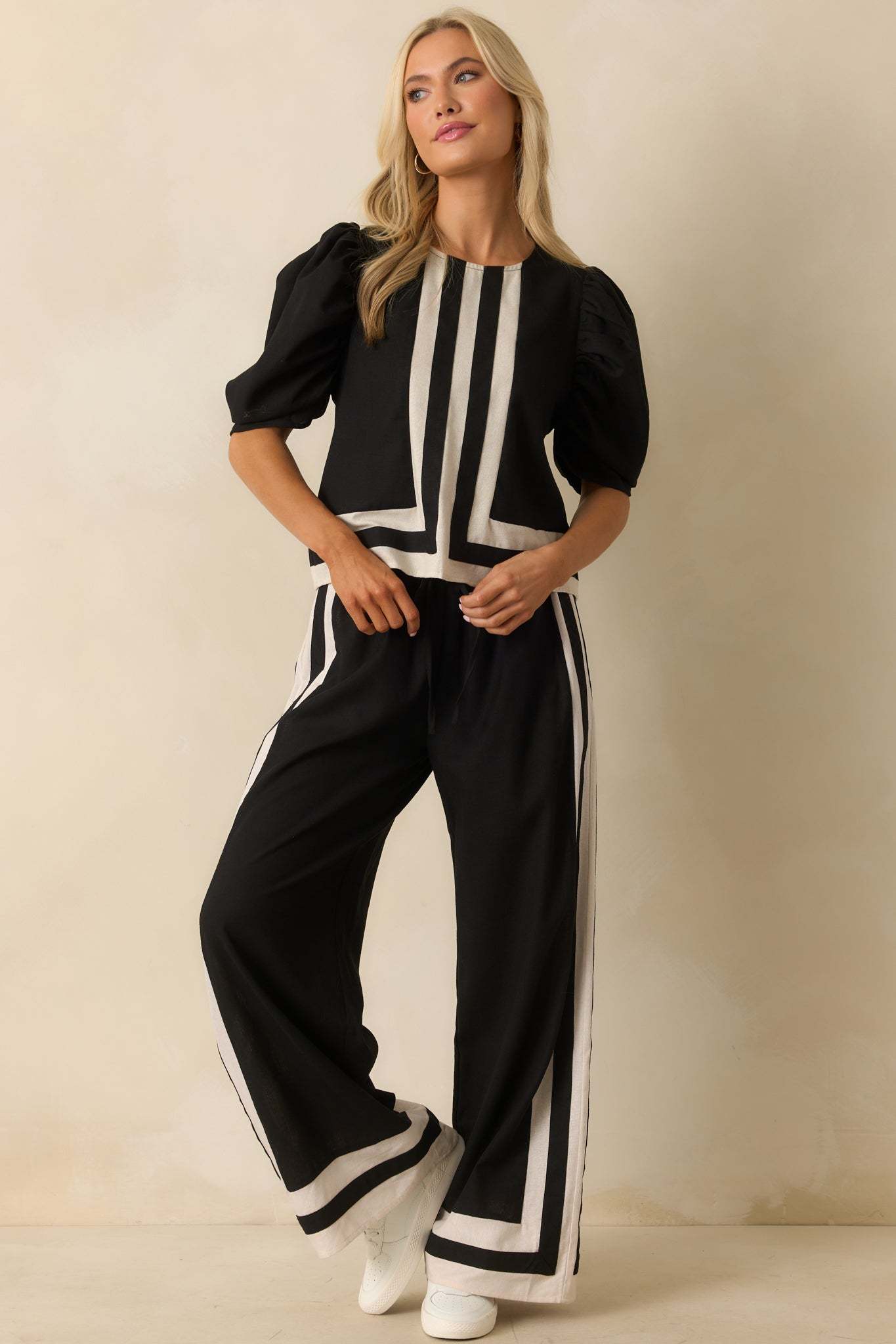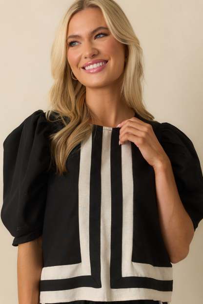 The It Was What It Was Black Contrast Trim Puff Sleeve Top keeps things fun and effortlessly put together. It’s the kind of piece that makes a statement without needing to say a word. This black top features ivory contrast trim and center seam, a crew neckline, back keyhole button closure, short puff sleeves, and a relaxed fit.