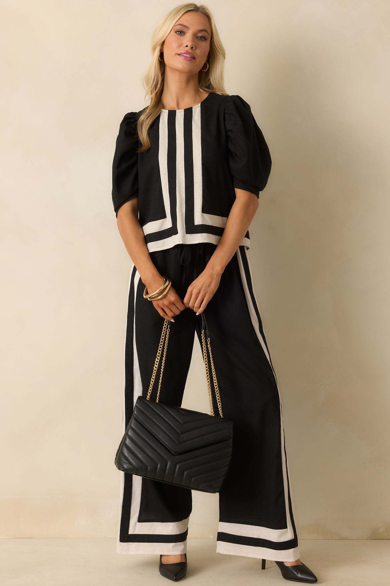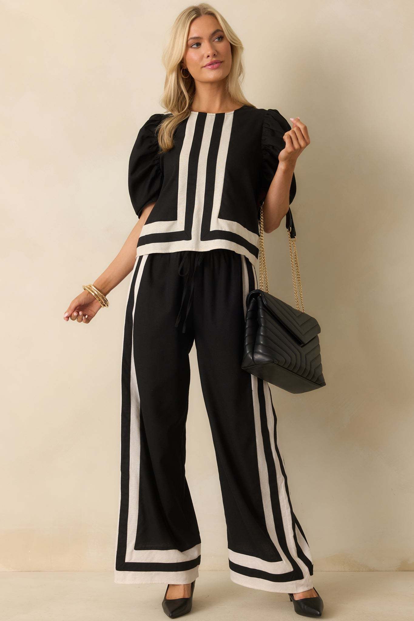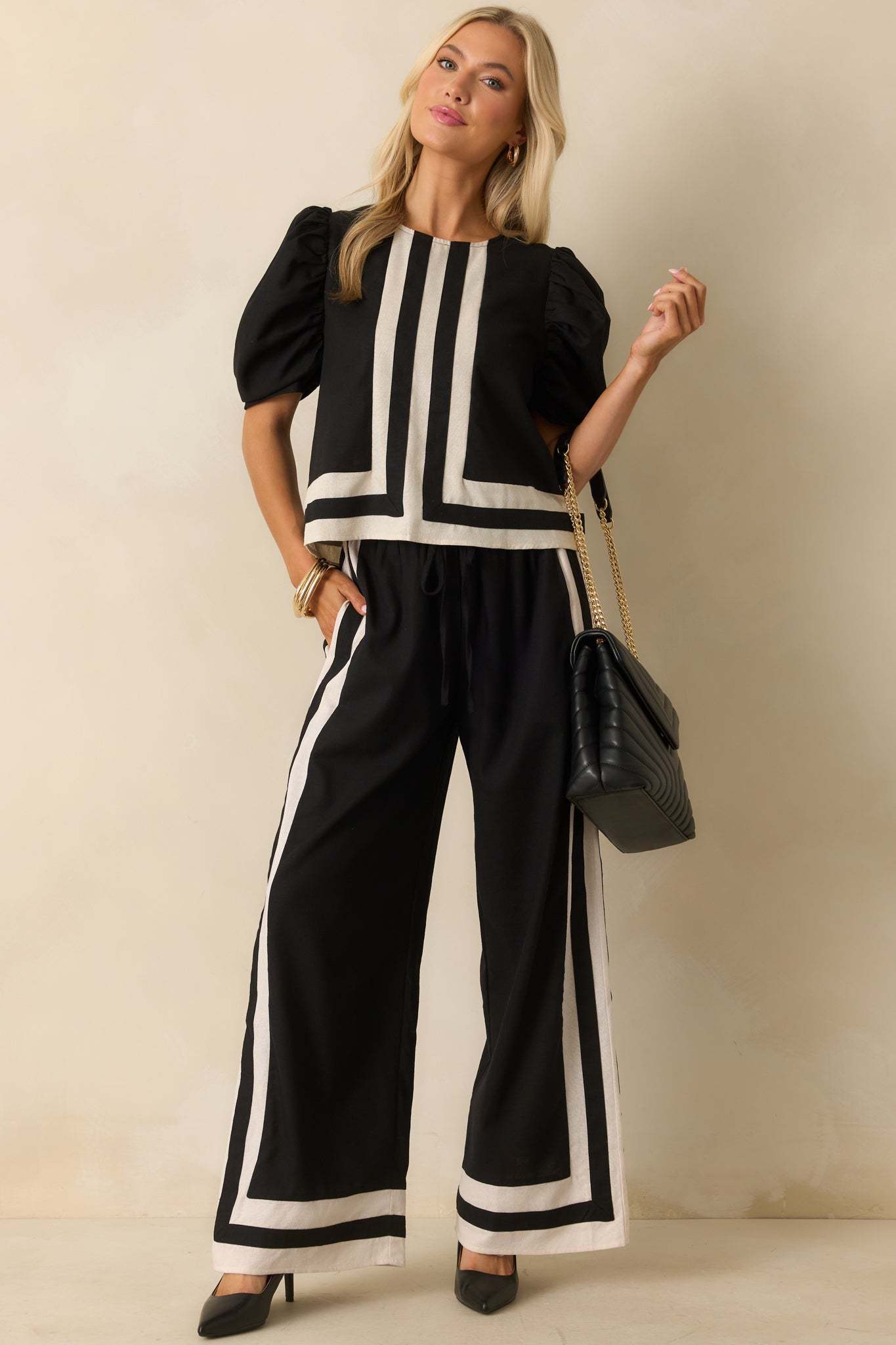 The It Was What It Was Black Contrast Trim Puff Sleeve Top keeps things fun and effortlessly put together. It’s the kind of piece that makes a statement without needing to say a word. This black top features ivory contrast trim and center seam, a crew neckline, back keyhole button closure, short puff sleeves, and a relaxed fit.