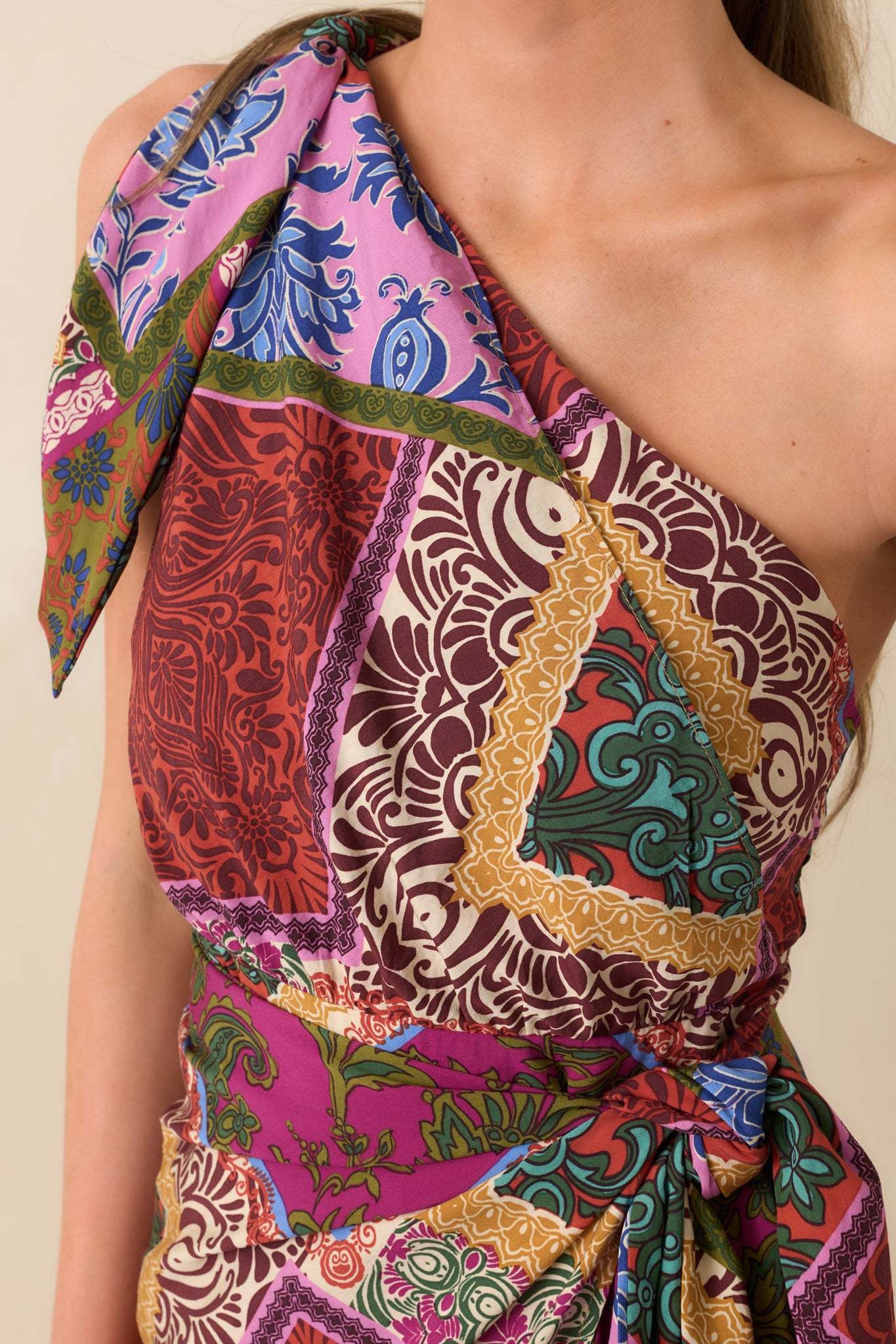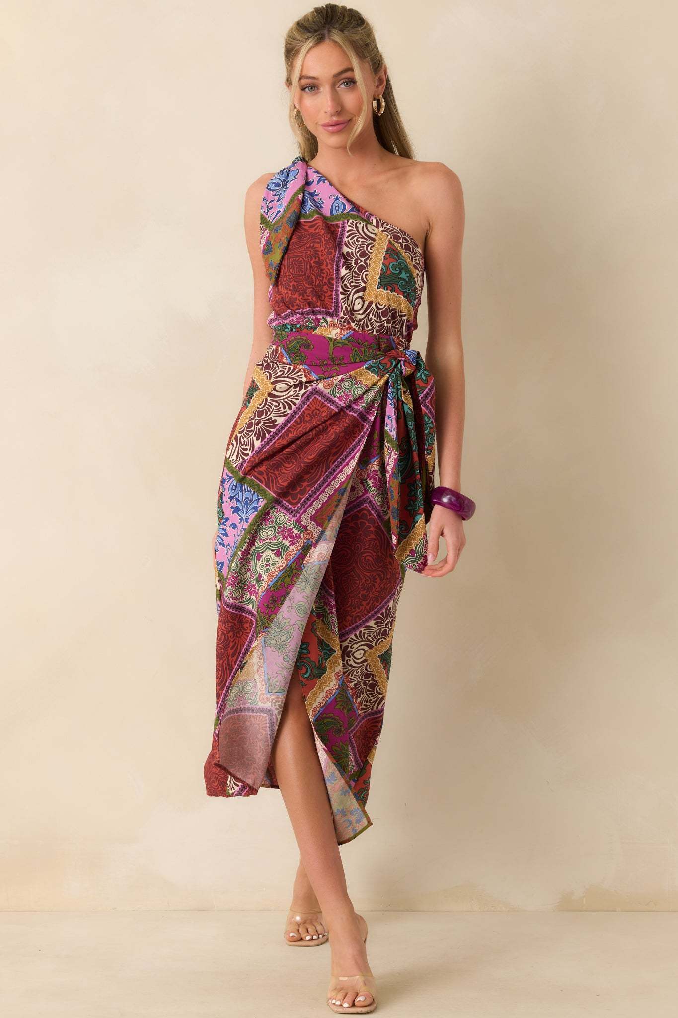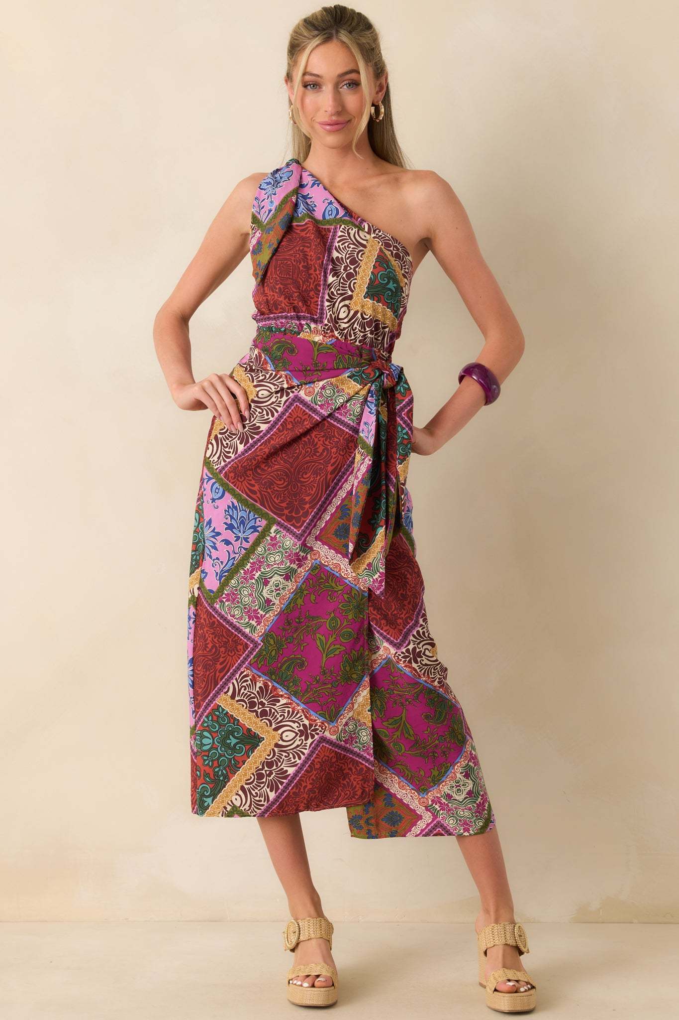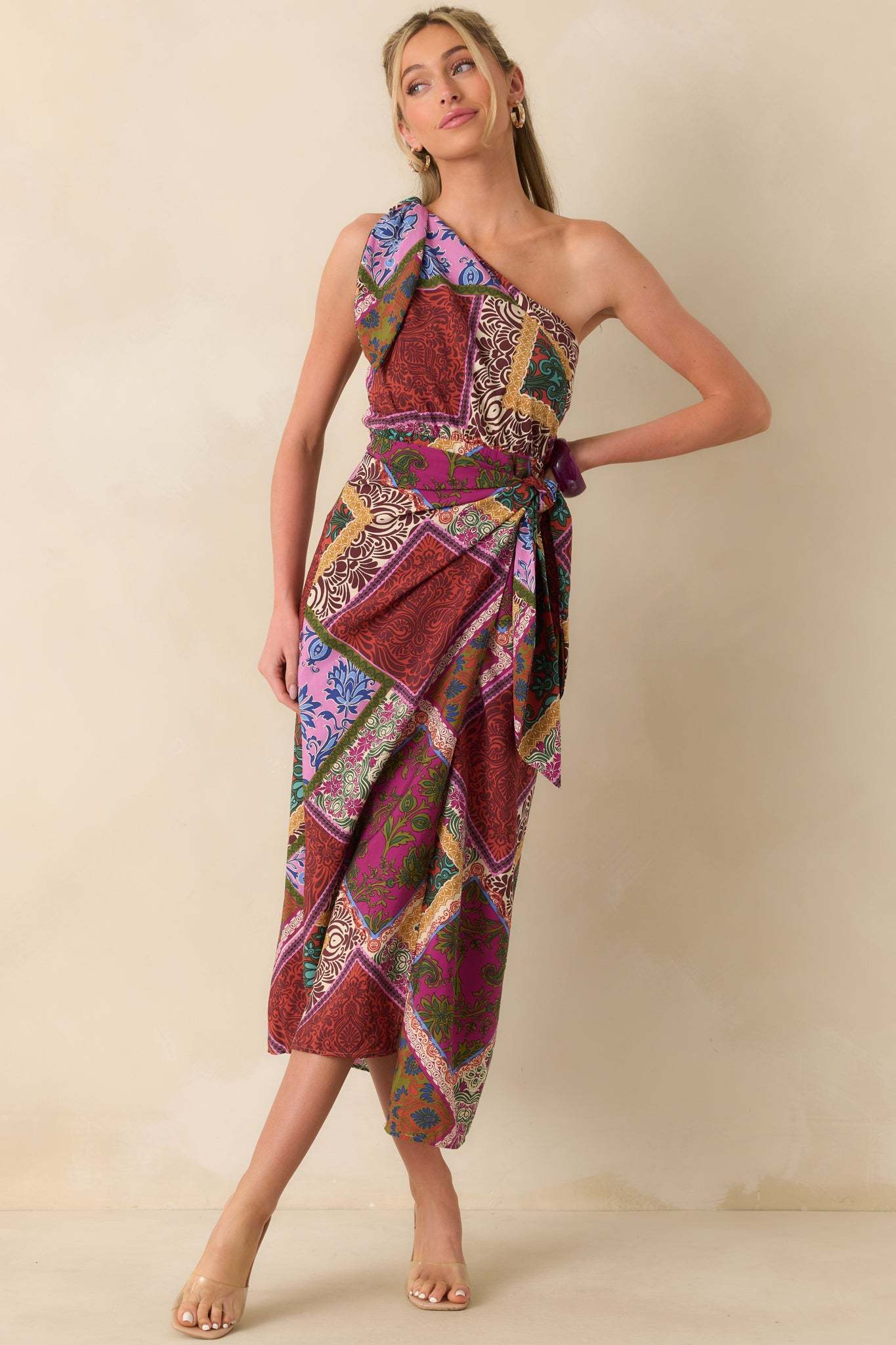 It’s All Settled Red Multi Patchwork Print One Shoulder Maxi Dress makes the whole outfit decision feel easy. It’s bold, beautiful, and brings that effortlessly put-together vibe every time. This maxi dress features a red multicolor patchwork print, decorative knot one shoulder neckline, smocked back panel, hidden back zipper, and an adjustable self-tie wrap-style skirt.