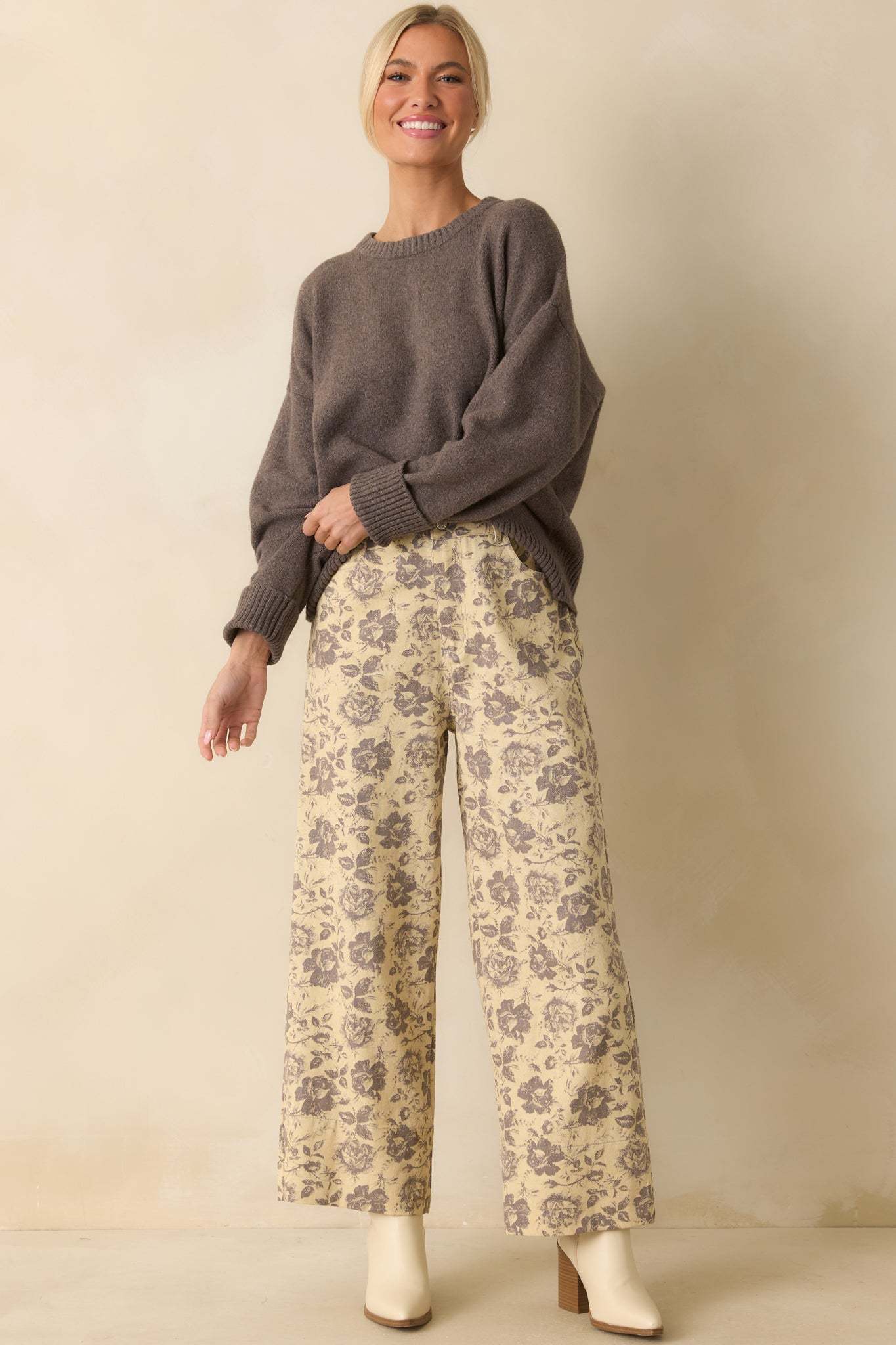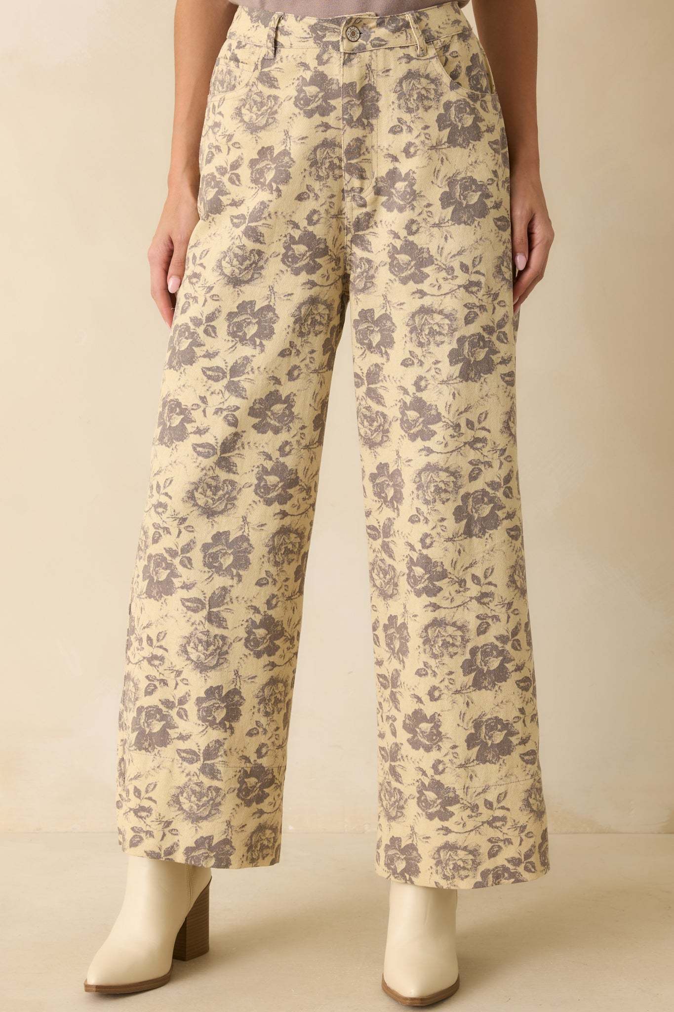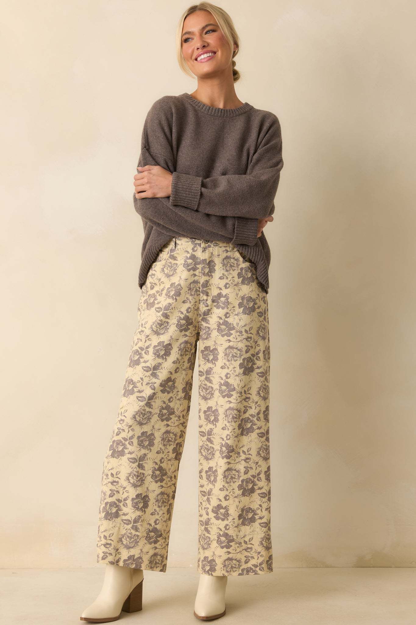 The Just Like Always Grey Floral Print Wide Leg Pants bring a touch of vintage romance to your everyday style, featuring a soft neutral base adorned with a washed grey floral pattern, blending timeless femininity with effortless sophistication. These grey floral print pants feature a soft woven fabric with a vintage-inspired rose pattern, designed in a high-rise silhouette with front pockets, belt loops, and a wide-leg cut for an effortlessly polished look.