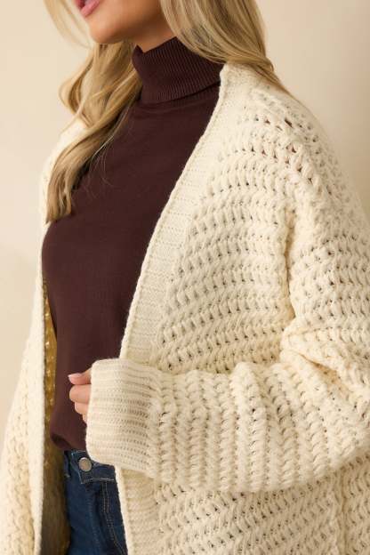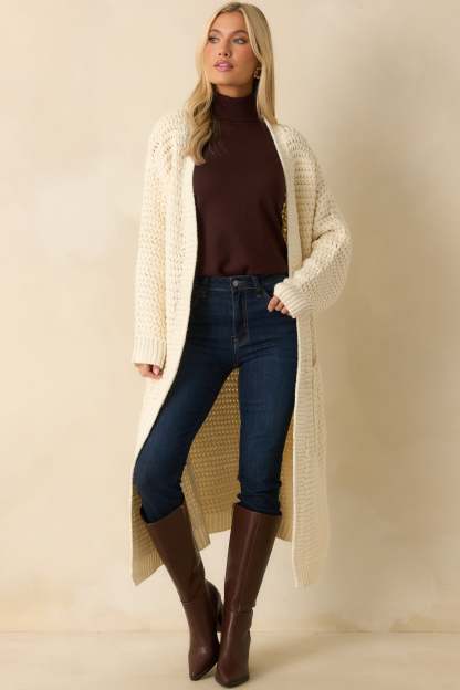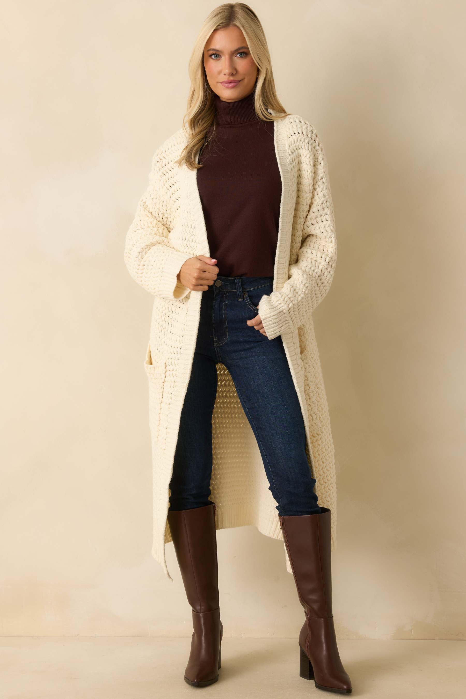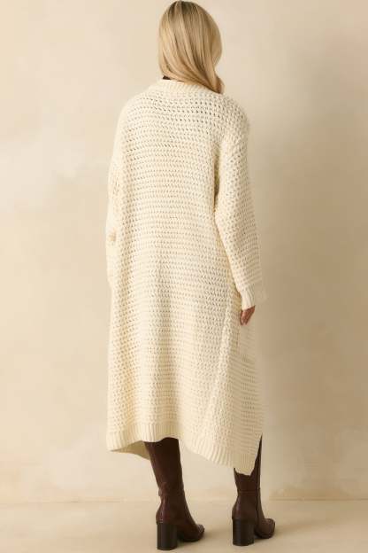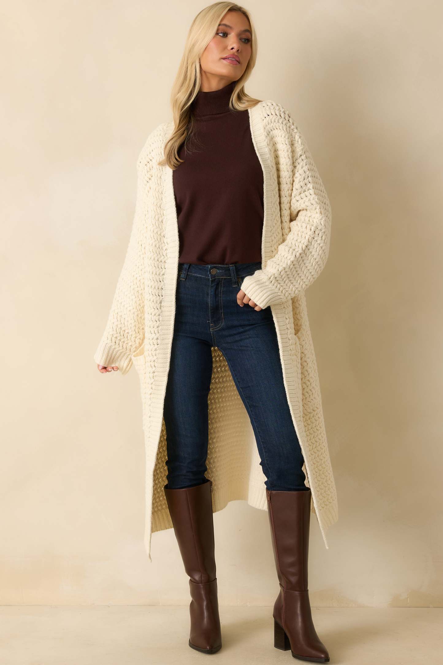 The Made For More Cream Knit Duster Cardigan proves that cozy can still make a statement. With its chunky textured knit, open front, and extra-long silhouette, it’s the layer that adds quiet confidence, and warmth, to every look. This cream knit duster cardigan features an open front, long sleeves with ribbed cuffs, front patch pockets, and a relaxed longline silhouette in a chunky textured knit.