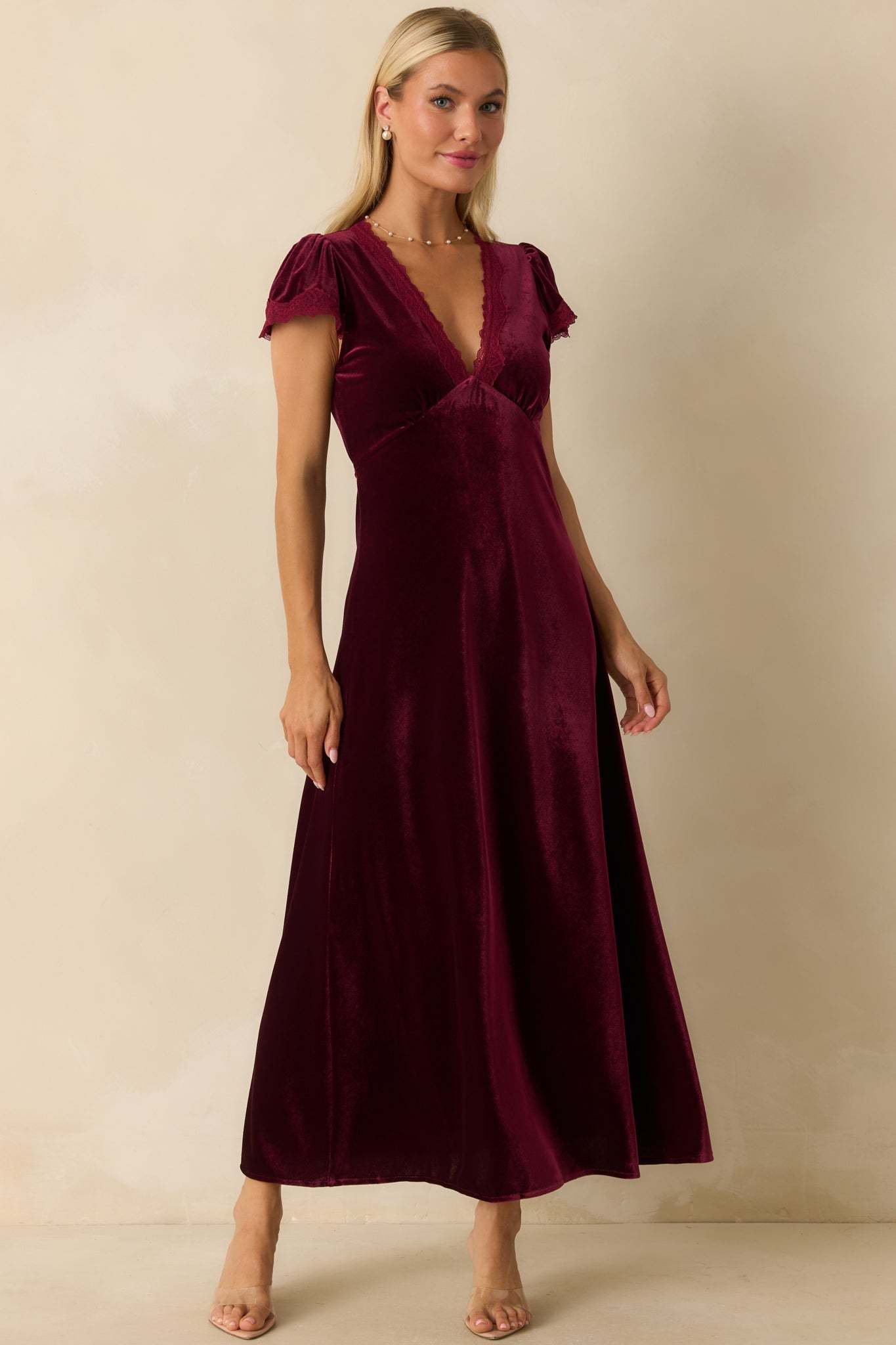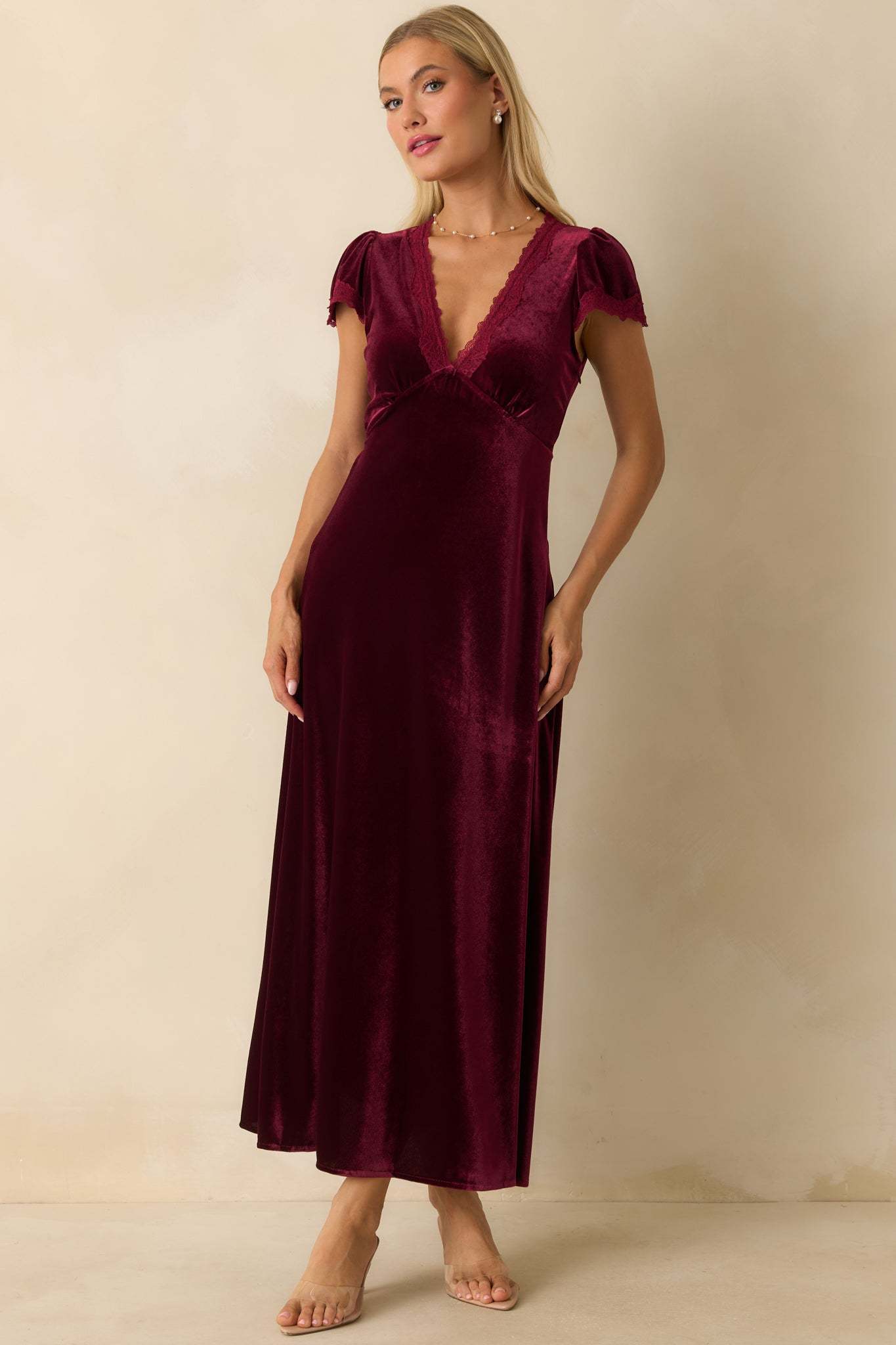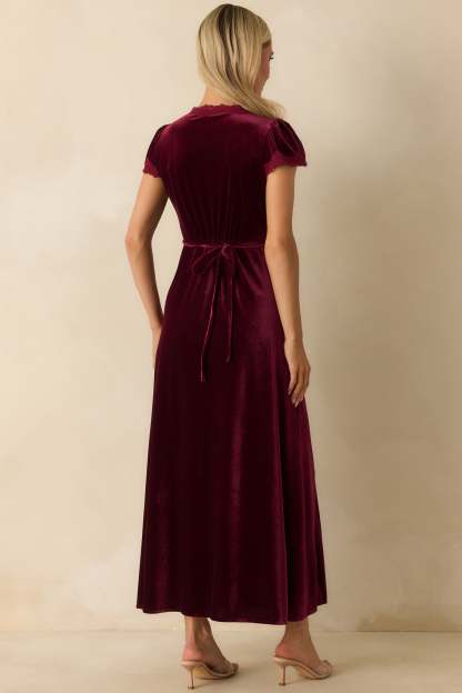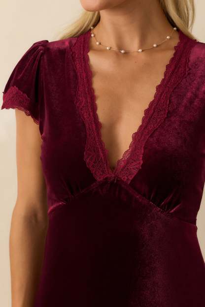 Made For The Moment Merlot V-Neck Velvet Maxi Dress captures quiet sophistication with its fluid drape and soft shimmer. Elegant lace trim and a deep merlot hue make this piece feel both timeless and striking—made for evenings that deserve to be remembered. This merlot red velvet maxi dress features a V-neckline with lace trim, short flutter sleeves, an empire waist, and a flowing A-line skirt.