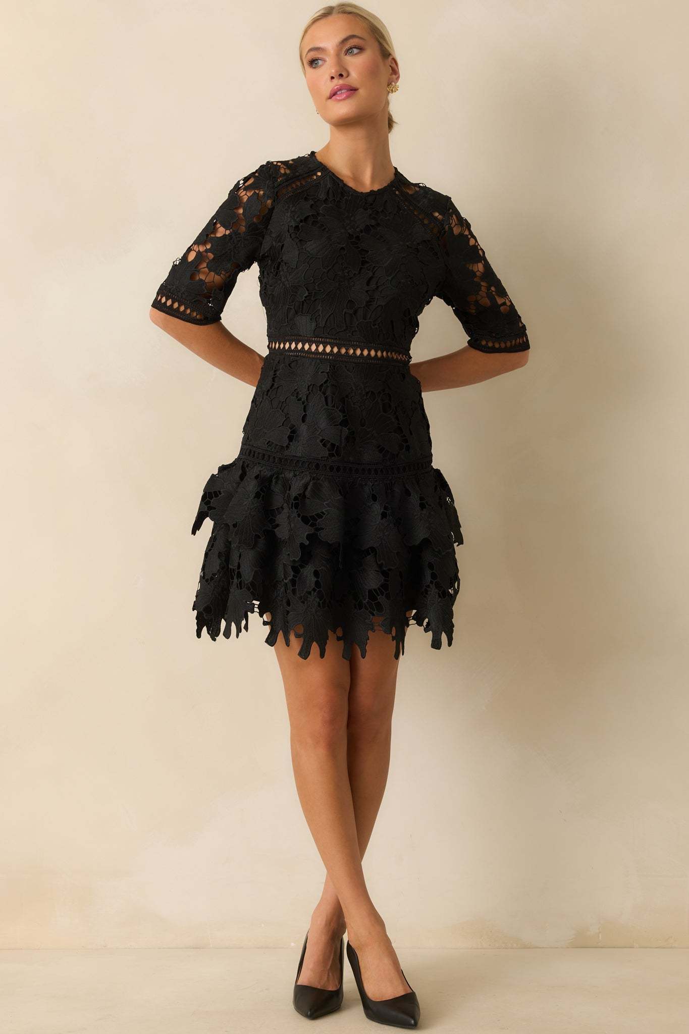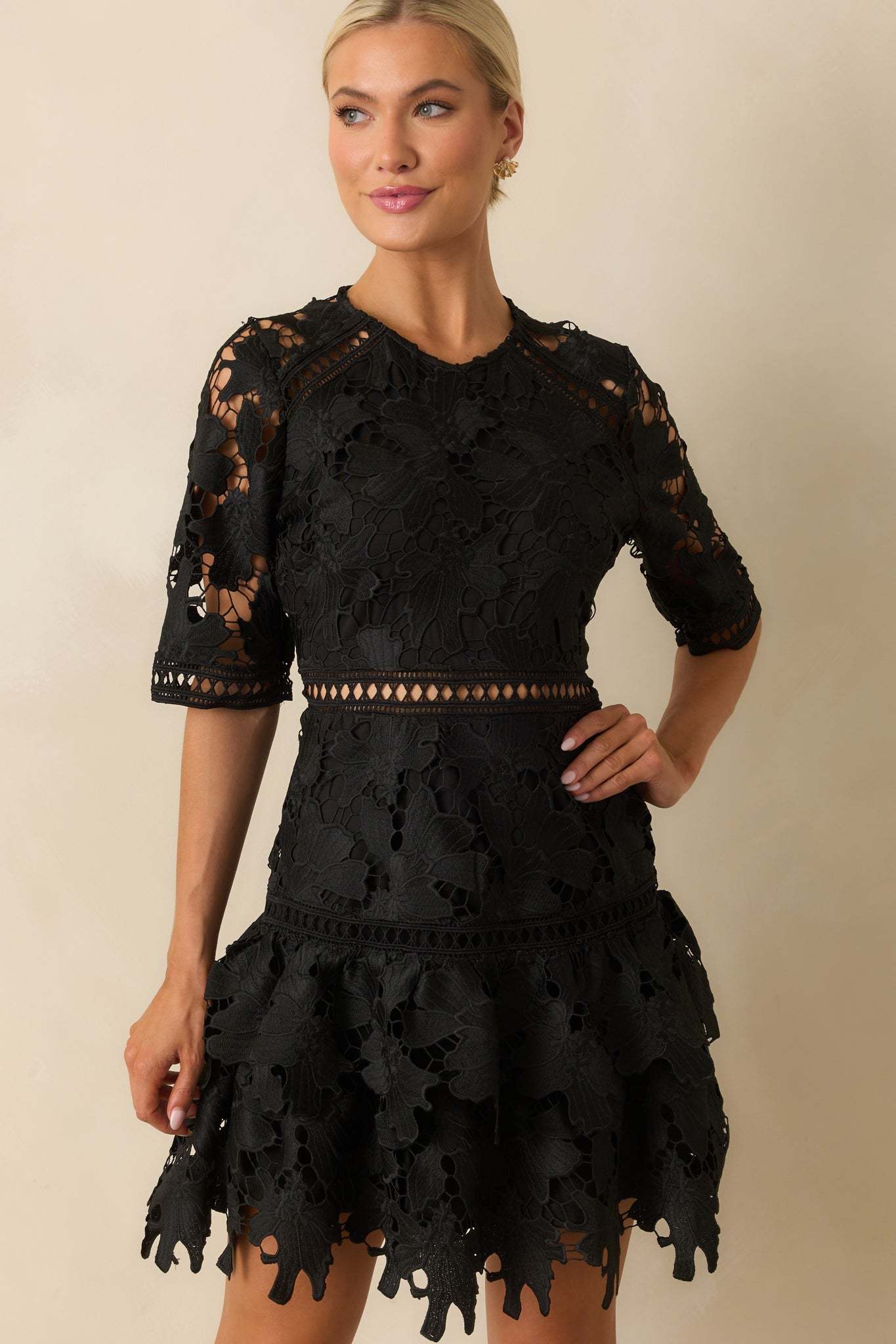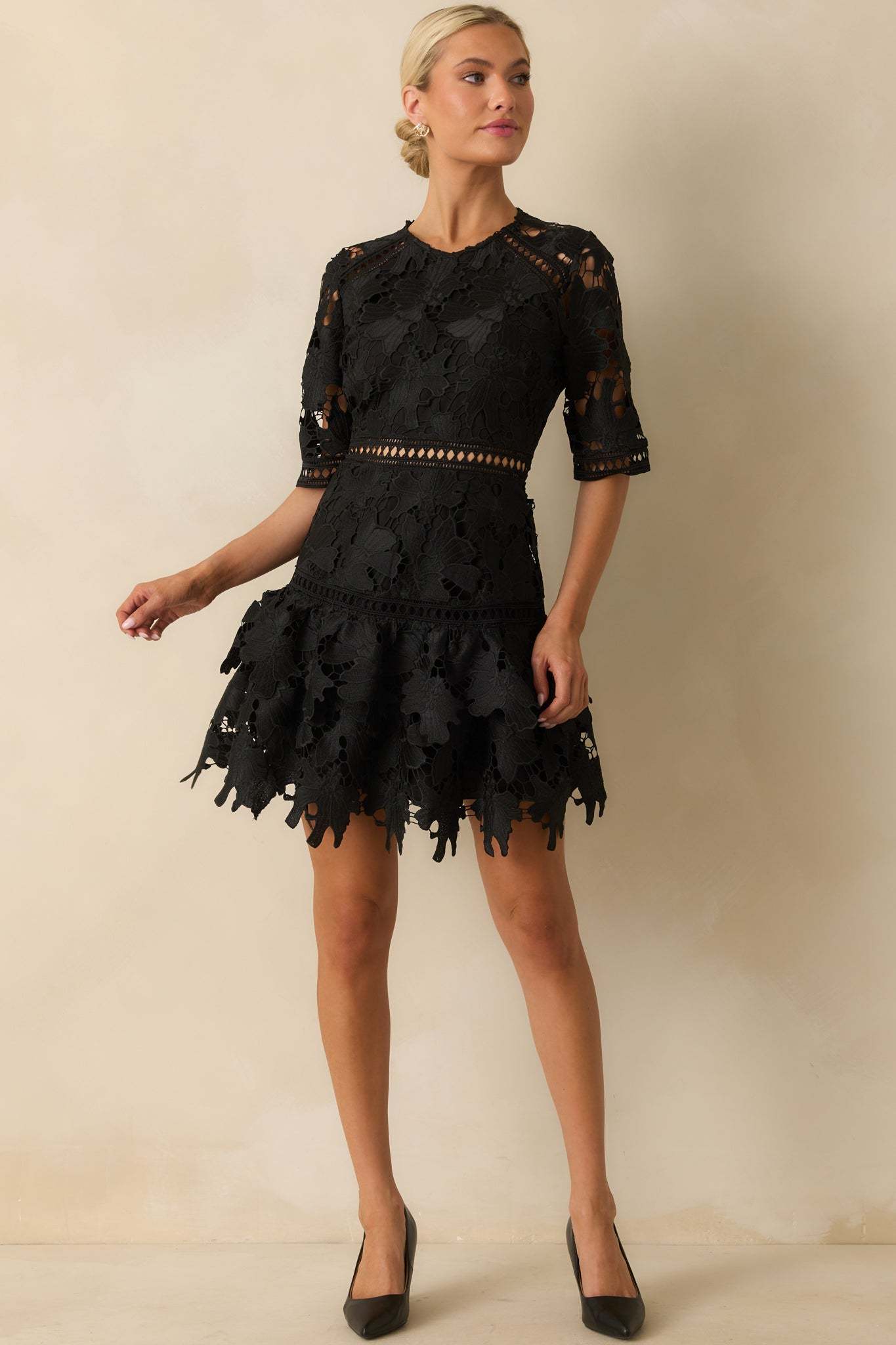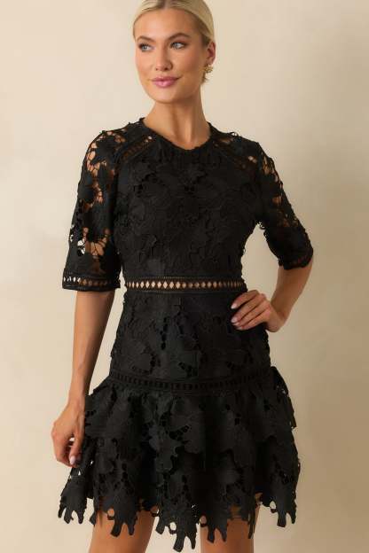 The No Compromise Black Floral Guipure Lace Scallop Hem Mini Dress holds nothing back, a striking look that delivers drama and elegance without settling for less. This black mini dress features a floral guipure lace fabric with sheer cutout detailing, round neckline, half sleeves with scalloped edges, a fitted bodice with a sheer waistband inset, hidden back zipper closure, and a tiered ruffle hem with a scalloped edges.