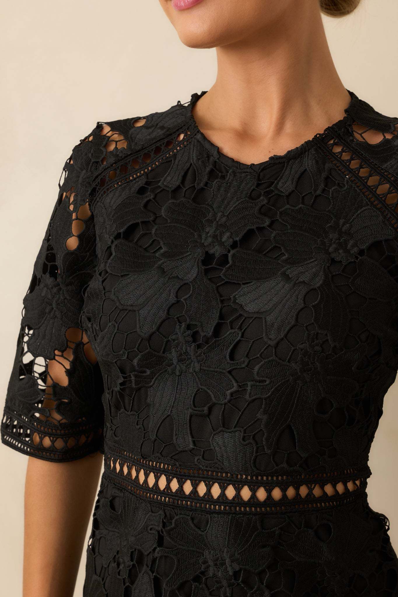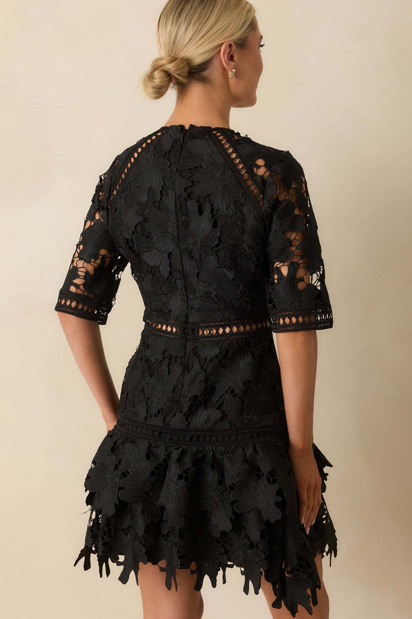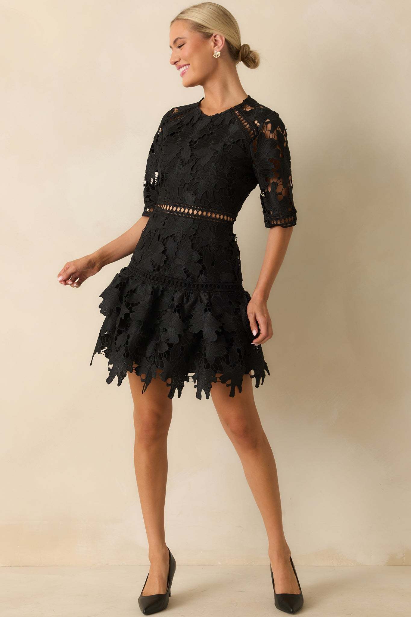 The No Compromise Black Floral Guipure Lace Scallop Hem Mini Dress holds nothing back, a striking look that delivers drama and elegance without settling for less. This black mini dress features a floral guipure lace fabric with sheer cutout detailing, round neckline, half sleeves with scalloped edges, a fitted bodice with a sheer waistband inset, hidden back zipper closure, and a tiered ruffle hem with a scalloped edges.