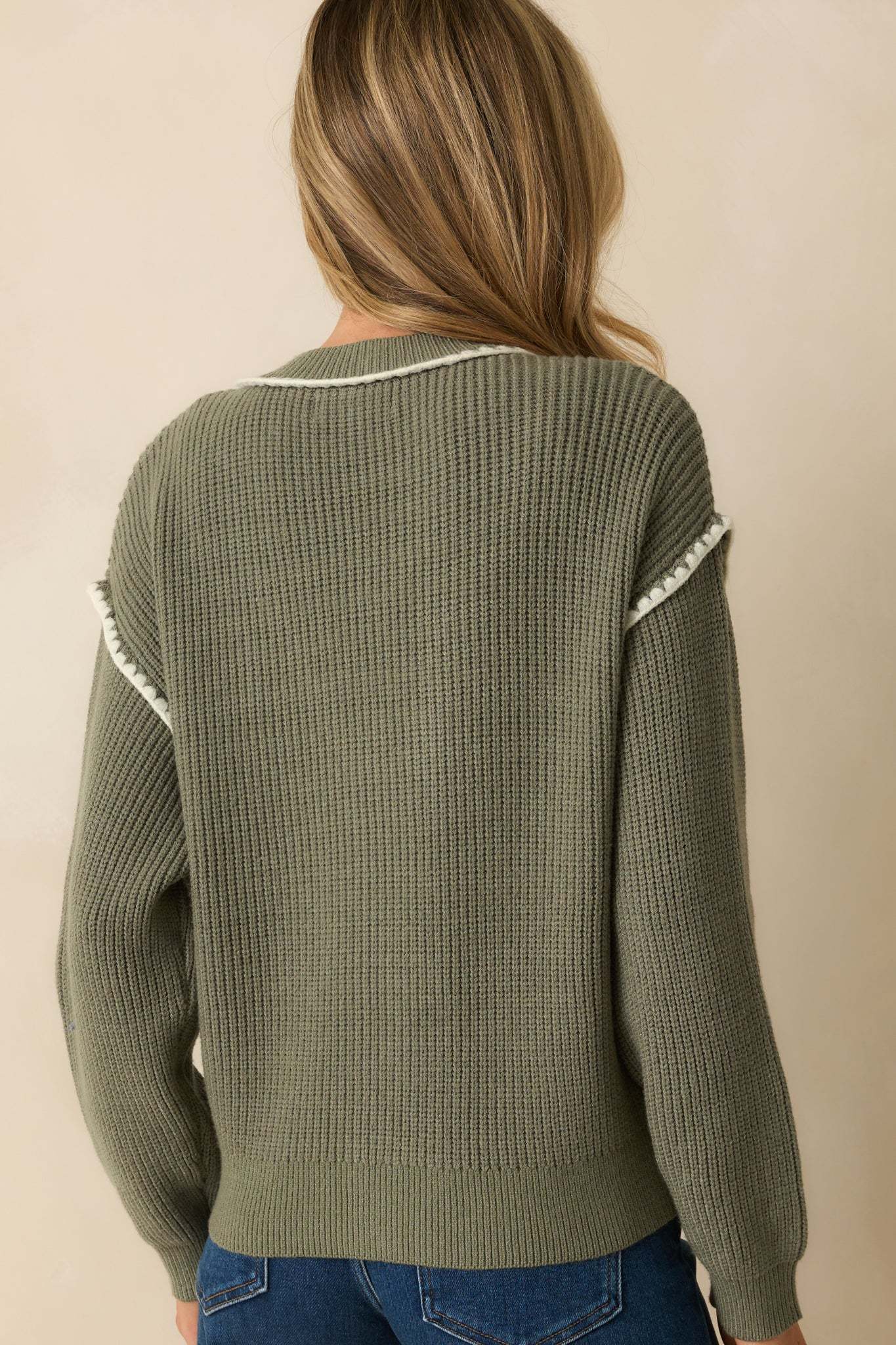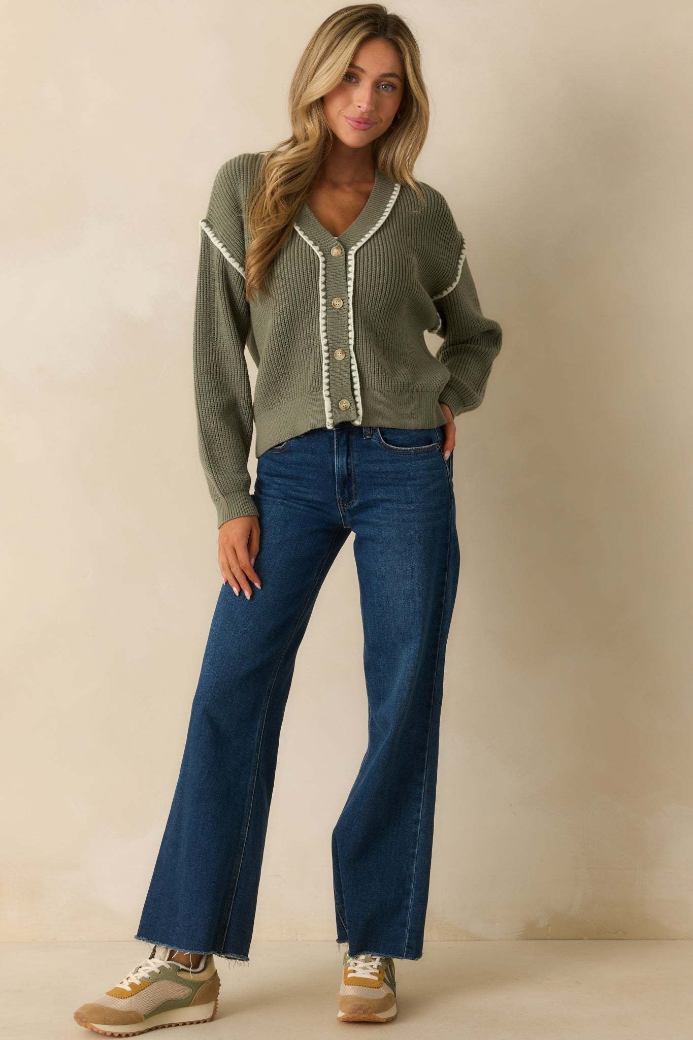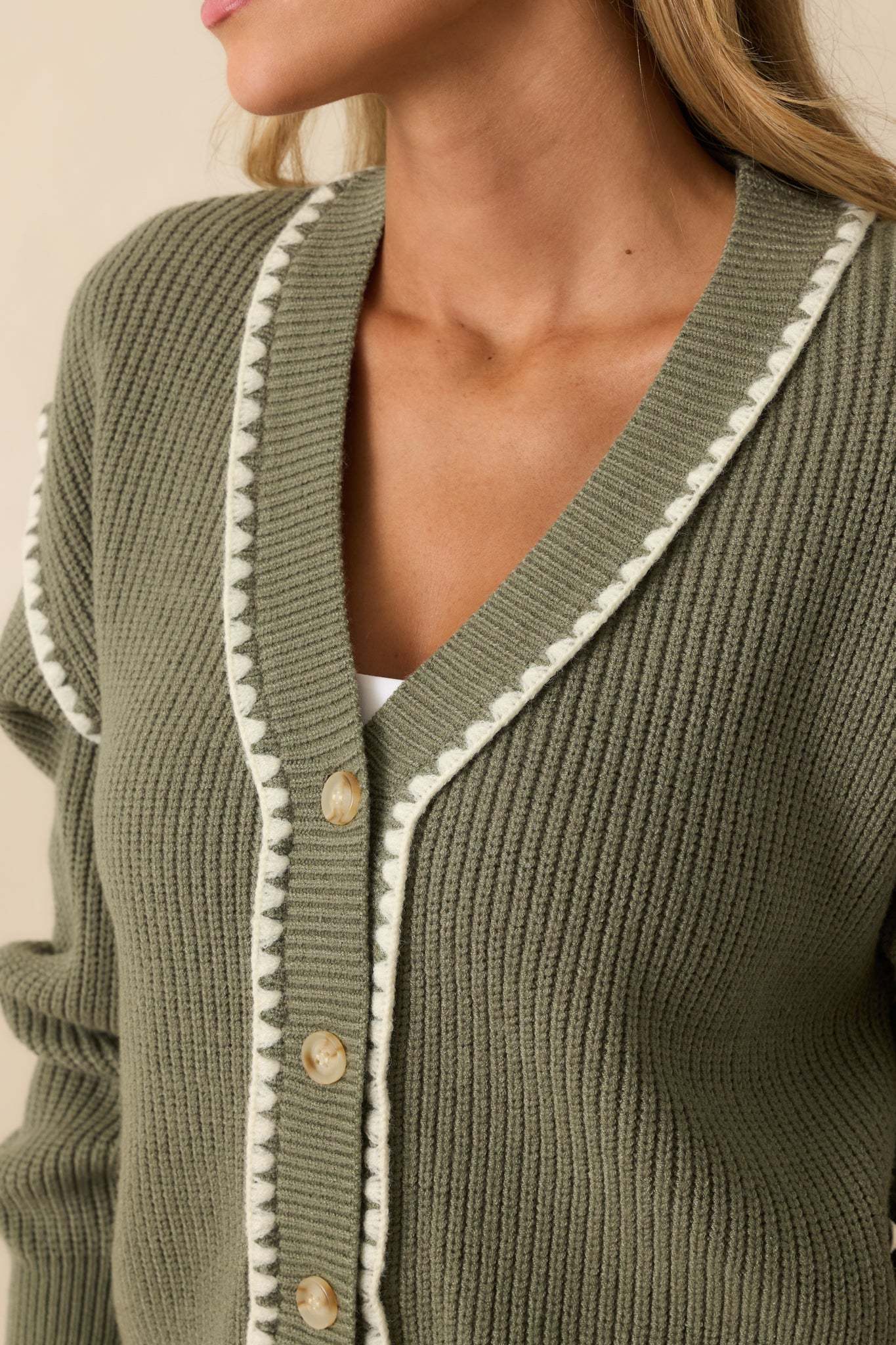 The On The Mark Sage Green Contrast Trim Knit Button Up Cardigan hits just right, a polished layer that adds instant confidence to your everyday style. This sage green cardigan features a functional button front, ribbed knit construction, v-neckline, long sleeves, and contrasting white whipstitch trim along the edges and sleeves.