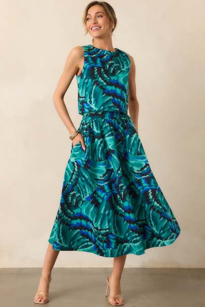 The Prosperina Thena Blue Multi Abstract Print Cotton Midi Skirt brings a cheerful charm, the kind of piece that makes getting dressed feel simple and a little more fun. This midi skirt features a blue multicolor abstract print, a high rise waist, an elastic back waist insert, full lining, and functional pockets.