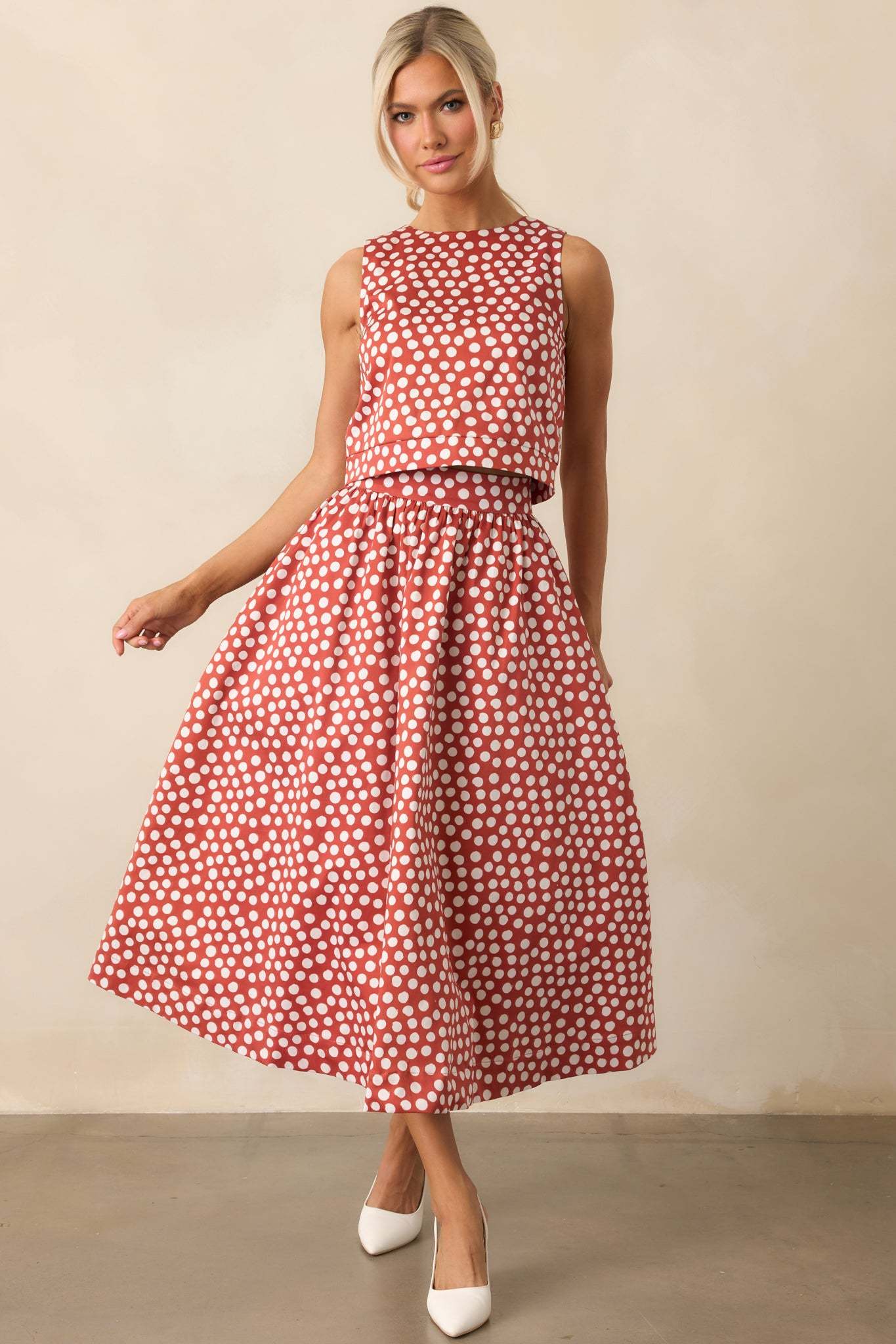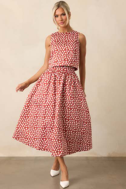 The Prosperina Thena Brick Red Polka Dot Cotton Midi Skirt brings a cheerful charm, the kind of piece that makes getting dressed feel simple and a little more fun. This midi skirt features a brick red and white polka dot print, a high rise waist, an elastic back waist insert, white lining, and functional pockets.