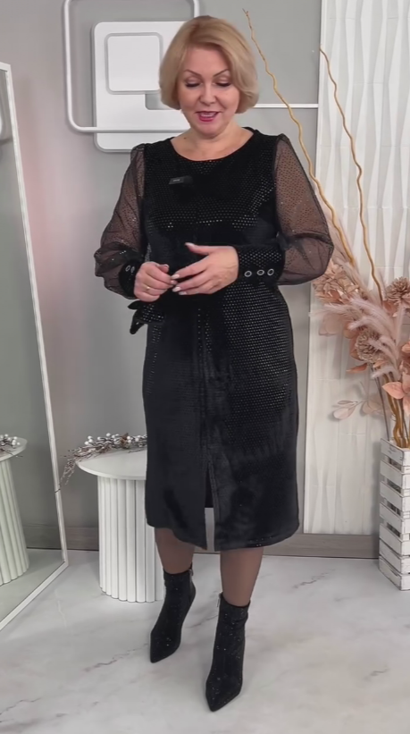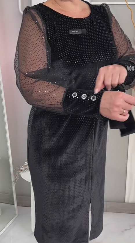 Przedstawiamy wyrafinowaną sukienkę midi – połączenie czarnej welurowanej tkaniny, spakowanymi detalami na całej powierzchni, półprzezroczystymi koronkowymi rękawami oraz rozcięciem, idealna dla kobiet, które cenią luksus i eleganckość na imprezy lub randki. Ta sukienka to więcej niż tylko odzież: to symbol pewności siebie i wyrafinowania, która sprawi, że czujesz się pewnie i fashionable. Wykonana z wysokiej jakości materiału, łączy funkcjonalność z artystycznym designem. Czarny kolor dodaje spokoju, a spakowane elementy nadają stylizacji premium charakteru – idealna na różnorodne okazje.