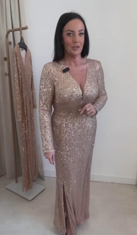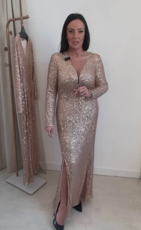 Długa sukienka z głębokim rozcięciem w serek i cekinami