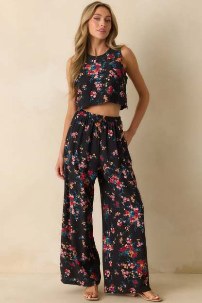 Wherever your day takes you, the Roam and Bloom Black Multi Floral Print Crop Top brings a touch of charm to every moment. With its open-back detail and easy cropped fit, it’s made for pairing with sunshine, slow mornings, and your favorite wide-leg pants. This black floral print crop top features a sleeveless design, round neckline, open-back cutout with a button closure, and lightweight woven fabric with a relaxed, cropped fit.