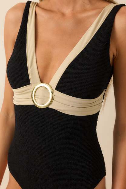Get beach-ready with our Seagulls and Sunsets black one piece swimsuit. Made to flatter and fit comfortably, this swimsuit will keep you stylish and confident while you soak up the sun. Perfect for any beach day or pool party, this black one piece is a must-have for your summer wardrobe! This one piece features a v-neckline, a gold accent ring, shimmer detailing, a textured material, an open back, and a full coverage backside.