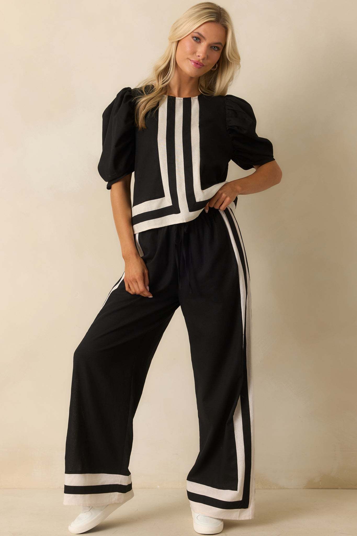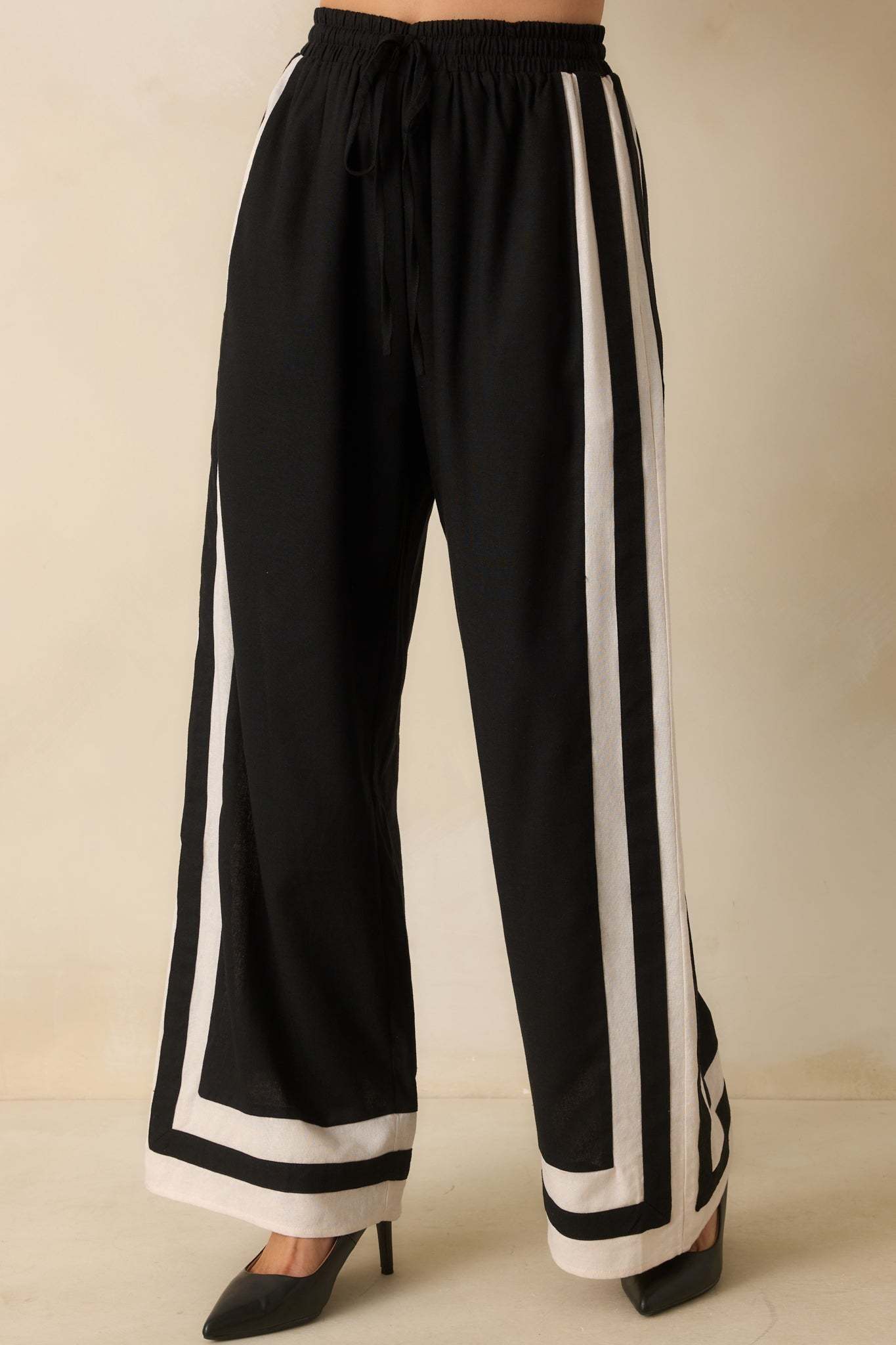 The She Always Knows Black Contrast Trim Linen Blend Wide Leg Pants are a laid-back take on everyday confidence. Relaxed but styled, they’re perfect for when you want to keep things cool and collected without trying too hard. These black pants feature an ivory and black contrast trim throughout, a high rise, elastic waistband, adjustable self-tie drawstring, wide leg design, and functional pockets.
