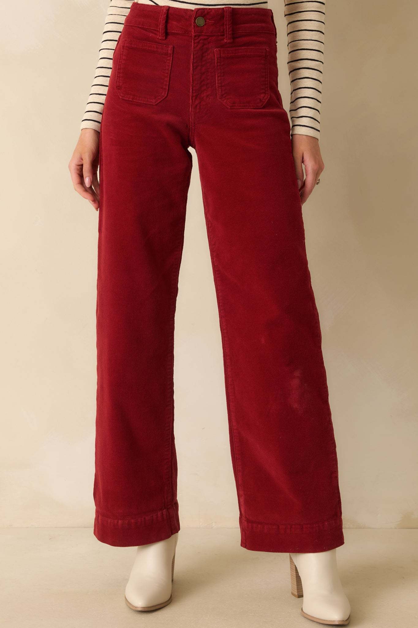 The That Works For Me Deep Red Corduroy Wide Leg Pants bring a bold yet classic twist to your cold-weather rotation. With their rich color and retro-inspired texture, they’re equal parts statement and staple - made for pairing with everything from crisp button-ups to cozy knits. These deep red pants feature a soft corduroy fabric, a high-rise waist, functional patch pockets, belt loops, a zip fly with button closure, and a wide leg silhouette.
