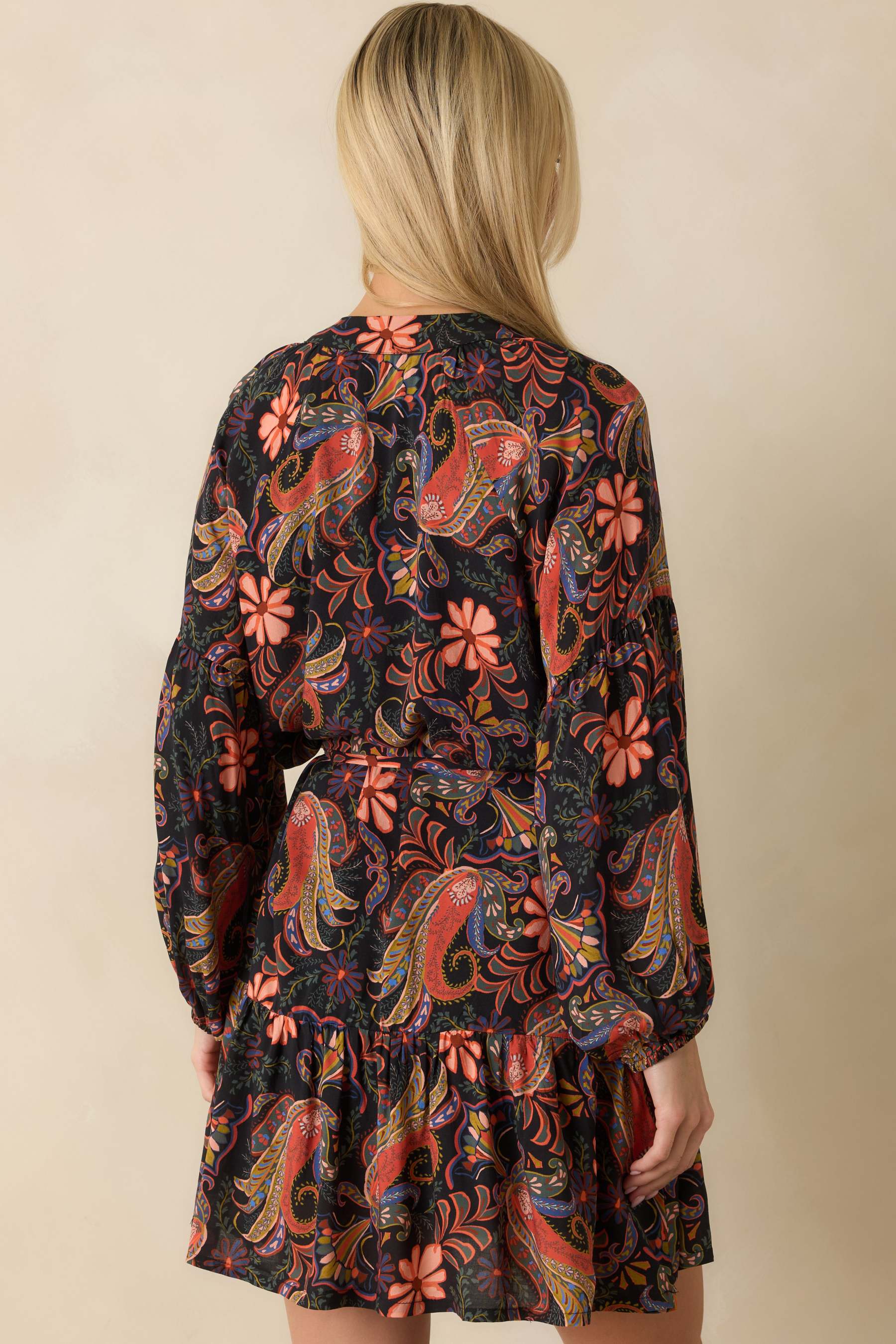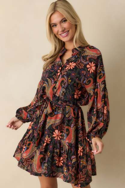 The Way It Flows Orange Multi Floral Paisley Mini Dress captures the free-spirited charm of the season in every detail. With its swirling paisley print and warm autumn tones, this dress moves beautifully from day plans to dinner plans. The tie waist and tiered skirt add an easy, feminine shape that feels as effortless as it looks. This orange floral paisley print mini dress features a split neckline, long peasant sleeves with elastic cuffs, a self-tie waist belt, and a tiered skirt with a relaxed fit.