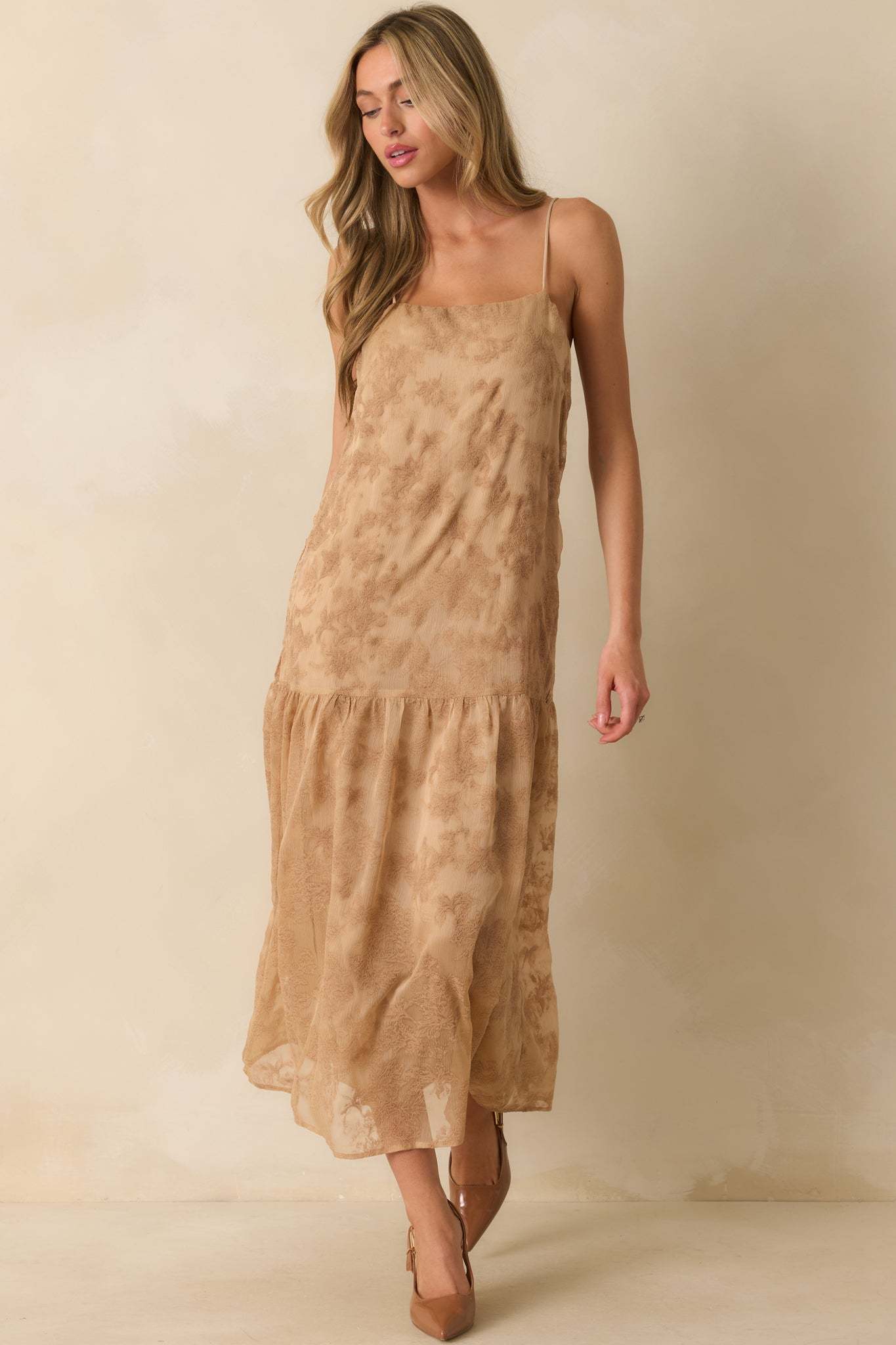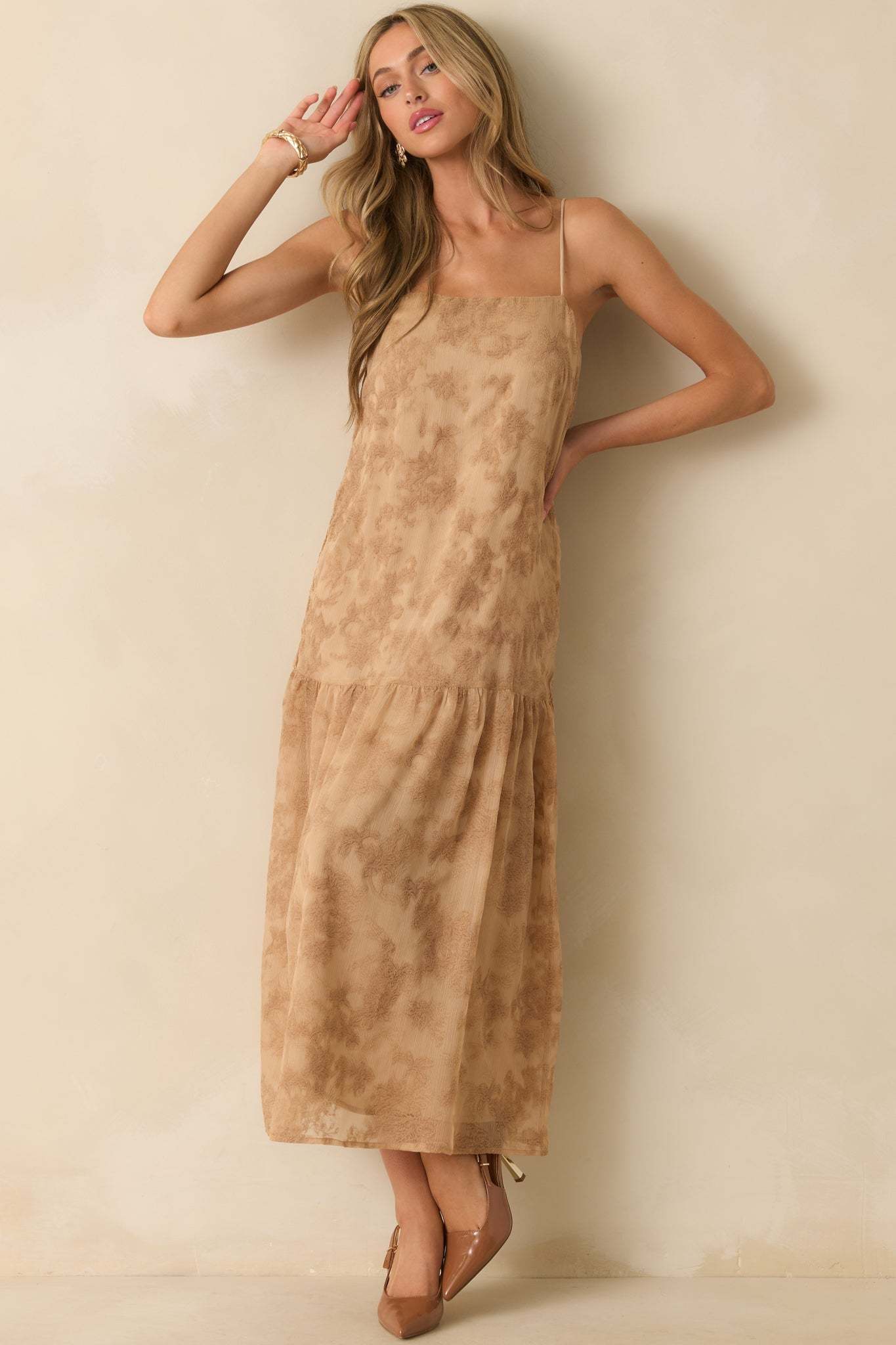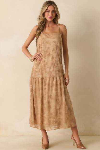 The You Tell Me Tan Textured Floral Print Chiffon Drop Waist Maxi Dress keeps things open-ended, an easy yet refined style that’s ready for whatever the day brings. This tan maxi dress features a textured floral print, lightweight textured overlay, straight neckline, spaghetti straps, relaxed bodice, drop waist silhouette, a softly gathered tiered skirt, full lining, and concealed side zipper closure.
