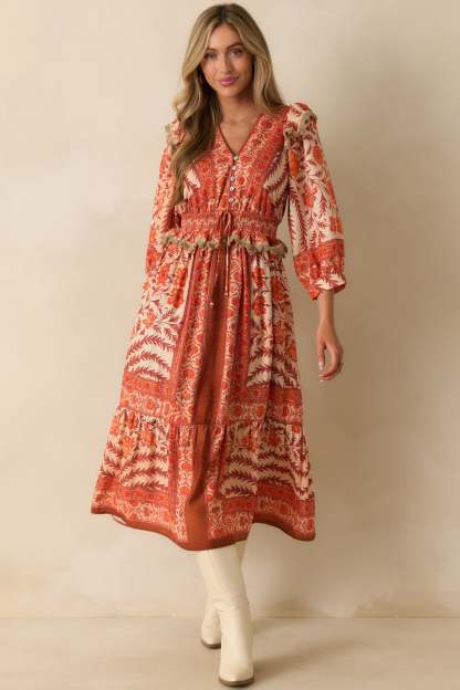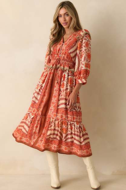 The You’ve Got This Orange Multi Floral Print Maxi Dress channels an elevated boho spirit, blending bold color and free-spirited style with a refined, effortlessly put-together feel. This orange maxi dress features a multicolor patchwork floral print, a v-neckline, button-front bodice, 3/4 length sleeves, elastic cuffs, ruffle trim detailing, smocked peplum-style waist with a drawstring self-tie, and a tiered skirt.