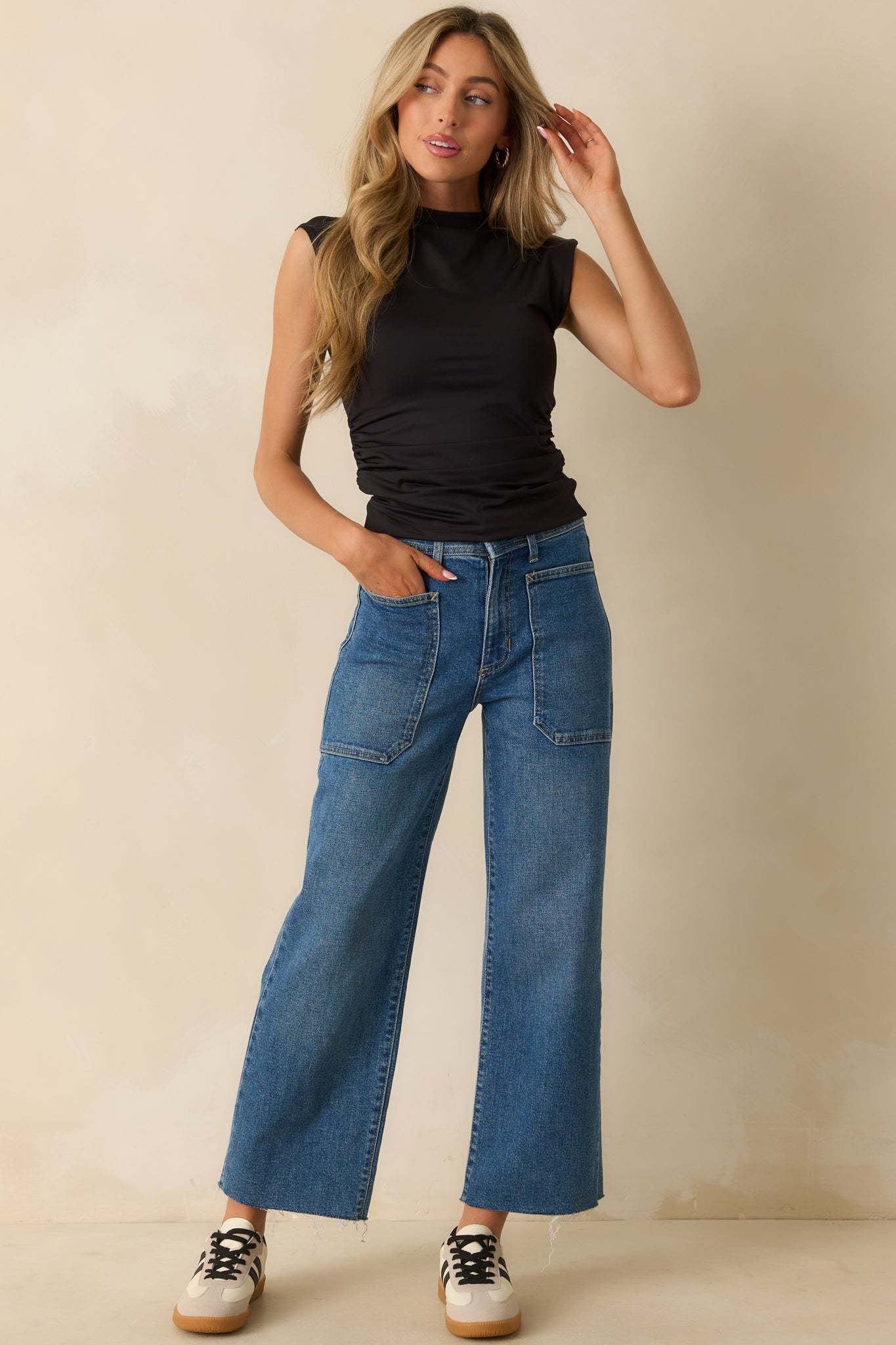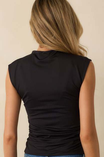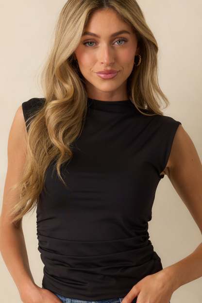 The Yve Black Sleeveless Ruched Mock Neck Top is clean and modern, a streamlined style with subtle details that keep simplicity feeling elevated. This black top features a mock neckline, sleeveless silhouette, side ruched detailing, and a stretchy fitted fabric.