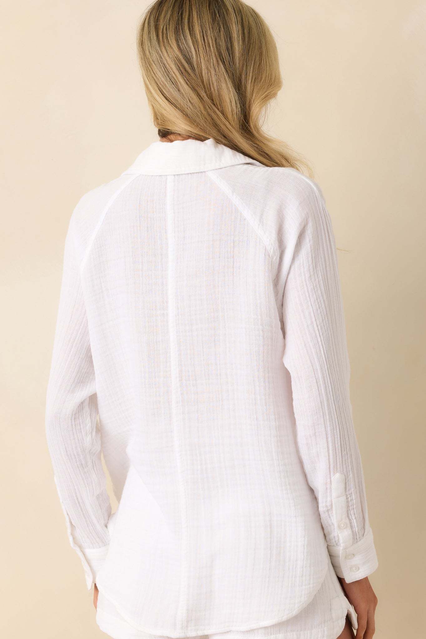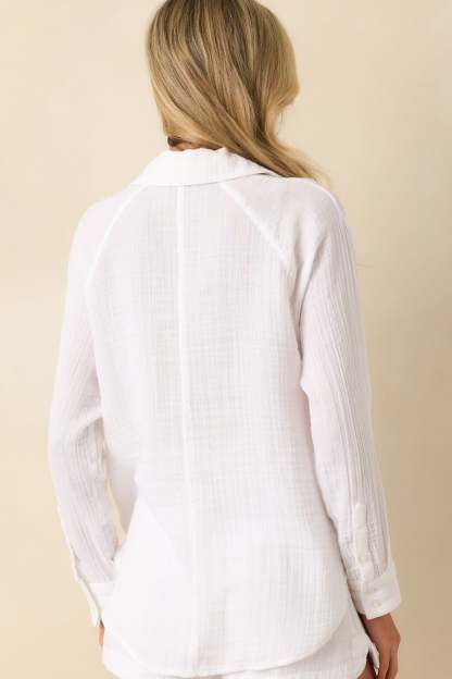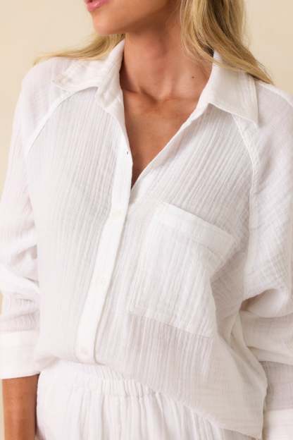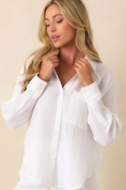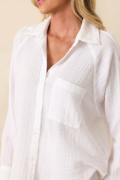 The Z Supply White Cotton Perfect Airy Gauze Button Up Top is made for everyday moments that feel just right. Light, breathable, and easy to style, it’s a go-to for layering over swimwear, pairing with denim, or throwing on after a long day. This white top features a 100% cotton crinkle gauze fabric, collared neckline, functional button front, functional breast pocket, scoop bottom hem, long sleeves, functional button cuffs, and a relaxed fit.